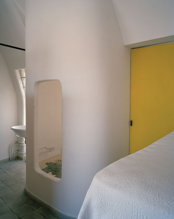 Ertsey Attila építész, tanár és teoretikus írja a megismerés korlátairól, „melyet a Heisenberg-féle határozatlansági reláció nevez meg, ahol a fizikai megismerés eszköze [pl. a fotográfia – megj. tőlem: Sz.Gy.] már torzítja az objektív tartalmat… A minimalista dobozépítészet dogmatikája szépen kifejlett. Lehangoló, ahogyan az egyetemi tervekben, portfóliókban leolvasható, a beérkezett, tehetséges és fantáziával megáldott gyerekek tervei lebutulnak… Ennek fogalmai az építészeti szaksajtóban közismertek: »szűkszavú«, »szigorú szerkesztés«, »visszafogottság«, »alázat«, »a kevesebb több« stb… Formái: nyers, homogén felületek, vonalkód-nyílásritmussal, akár templom, akár lakás, akár középület…”.#3 A MAK tárlata nekem ezt a látásmódot illusztrálja. Hogy valóban nem apologikus, amit látunk, azt például John Massey Phantoms of the Modern című sorozata bizonyítja. Az előbb idézett Mies van der Rohe („a kevesebb több” építészeti bon mot atyja) ház éteri dimenzióját megzavarja egy medence acélkorlátjára emberi gesztussal odavetett, száradó piros bikini. Candida Höfer és mások is a Los Angeles-i MAK társintézmény, a Schindler-ház (építész: Richard Neutra) rekonstrukciójának fennkölt ürességét, börtönszerű enteriőrjeit választották képeik témájaként – feltehetően ottani ösztöndíjas élményeik hatására. Az egyik „fürdőszobai fotó” egyenesen a náci tömeggyilkosok ál-zuhanyozóit idézi. Hogy ezt az asszociációt az alkotó tudatosan vagy „csupán” a XX. század zsigereinkbe építette, tudattalan készsége hozza-e létre, az szinte közömbös. Nem mellesleg: az előbb említett Jeremy Bentham által 1791-ben, Oroszországban papírra vetett „prófétai” börtöntervet, az úgynevezett „panoptikont” a modernitás egyik zéró-pontjának tekinti a történettudomány. Bentham két évszázaddal a képtechnológiákkal ellenőrzött/manipulált világfalu előtt feltalálta a „nagylátószögű” csillagbörtönt, melyben a paranoid hatalom mindent ellenőrizni kívánó tekintete a fókuszpont.4#