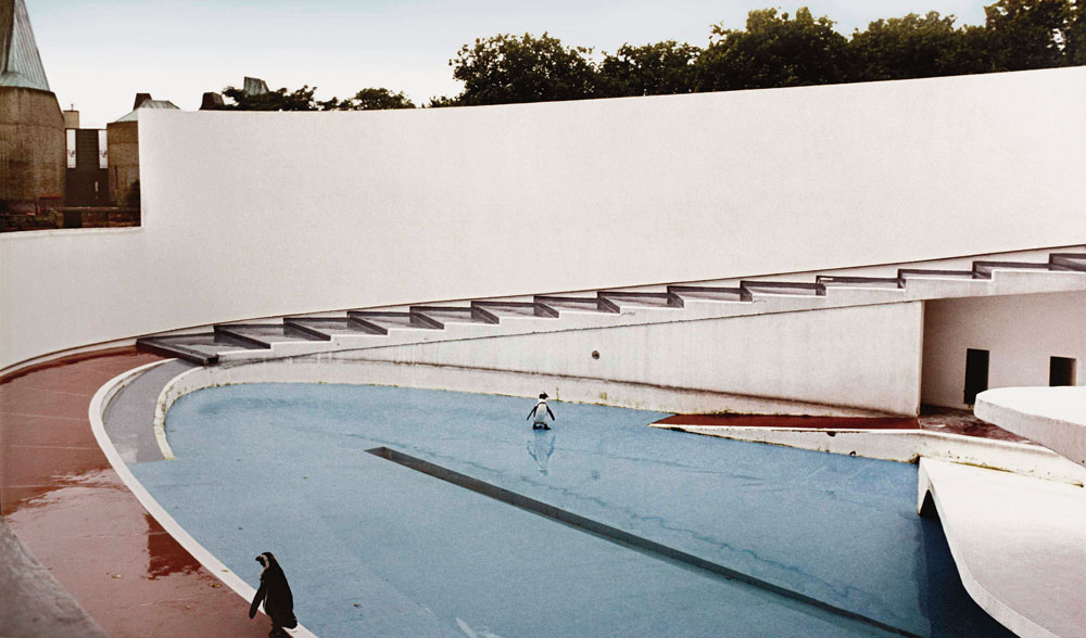 Én mindenesetre az óriásprintekkel szinte valós teret alkotó kiállítást kultúrakritikaként láttam, s a fenti tanulmányok szerzői által illusztrációként választott művek ezt az értelmezést erősítették. Simon Rees például Candida Höfer londoni állatkerti képét választotta, ezen egy magányos (antropomorf) pingvin keresi a lét értelmét – az üresség szimbólumaként láttatott „hiperorganikus” architektúrában.#1 Hal Foster viszont Reesnek a madridi Caixa Forum tükörlabirintus-lépcsőházának ábrázoló fotóját mellékeli írásához (az építészek itt is: Herzog & de Meuron#2). A szürke örvényben eltűnő lépcsőn lefelé menő figura a Nyugat alkonyának szarkasztikus parabolája. Barry Schwabsky tanulmányát Hirosi Szugimoto árnyék-sorozatából a Kunsthaus Bregenz épület-toposzának elmosódó sziluettje illusztrálja (építész: Peter Zumthor). A szándékosan felfokozott képhiba, életlenség, alulvilágítás a marketinggé redukált fotográfia görbe tükre. Annette Emde a hamburgi Veddeler Brückenstrassét, ezt a vigasztalanul üres és bágyadt modernis ta építészet-falansztert ábrázoló Thomas Struth-fotóval demonstrálja civilizációnk vektorait. Laurence A. Rickels a Dekonstrukció és a Töredék című kiállításrész installációjával is érzékelteti mondandóját. A gipszkartonvázra hevenyészve felrakott képek azt a Patyomkin-várost idézik, amit az angol Jeremy Bentham talált ki a bátyja által a cárnő számára tervezett, XVIII. századi volgai hajós országjárás díszletéül.