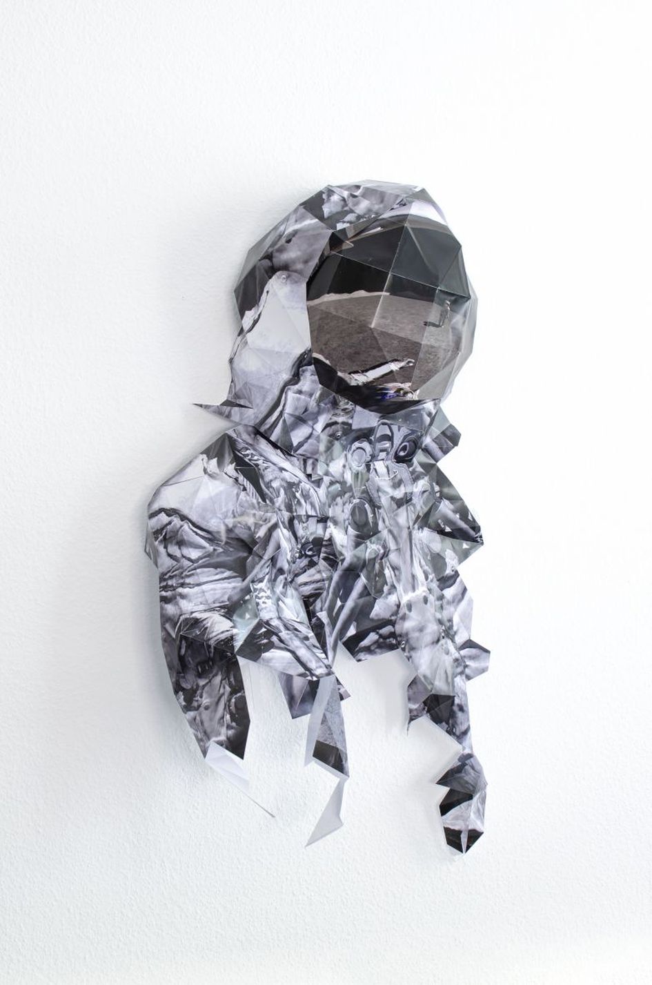 Kovács Edmond - ezzel ellentétben - a sík képből virtuális 3D objektumot képző szoftverek tökéletlenségére mutat rá. A virtuális 3D-s objektumok poligonokból épülnek fel, de a rájuk húzott minta és mappingborítás miatt a szem számára láthatatlan ez a töredezettség. Kovács Edmond a kétdimenziós fotográfiából generált virtuális tárgyakat ismét valós térbe helyezi át, méghozzá úgy, hogy a virtuális poligonok mentén síkba teríti ki a tárgyat, ezt kinyomtatja, és a valós térben újraalkotja, összeragasztja. A létrehozott papírmakettek az összetettebb formáknál szinte felismerhetetlenségig széttöredezett látványt nyújtanak. A szétlyuggatott Hold, vagy az űrben keringő, roncsra emlékeztető űrszonda disztópikus hangulatot áraszt. A végső mű a kiállítótérben installált makettek egy részéből áll, míg egy másik részük fotóreprodukción látható, amelyek Szabó Dezső kis méretű, megrendezett riportképeit idézik. Azonban az egyik képen használt zöld háttér utal a filmiparban elterjedt CGI-technikára is, amelyről könnyen asszociálhatunk a szimuláció és a valóság közötti problematikára, illetve azokra az etikai kérdésekre, amelyeket például a filmiparhoz közvetlenül kapcsolódva a színészek élethű digitális klónozása, illetve az elhunyt hírességek digitális újraélesztése vet fel.
