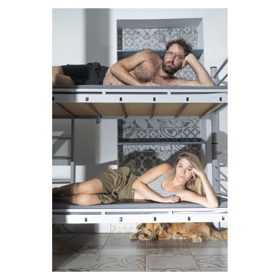 Ugyancsak 2019-ben dolgozott a telepen Tranker Kata. A sziget sörözőjében egy régi fotóra bukkant, amely két kidolgozott felsőtestű evezőst örökít meg, akik csónakjukkal és egy-egy evezőjükkel háromszöveg formálnak, s abból néznek a kamerába. A talált fotó nyomán helyi anyagokból, például folyami kagylókból egy objektet hozott létre a művész. Íme, egy fotóalapú kisplasztika.