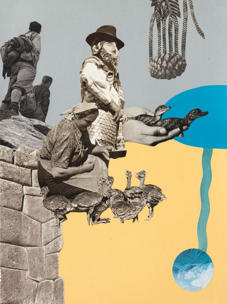 Ugyancsak a kollázs elvén állnak össze, és a sziget természeti környezetére reflektálnak Szemző Zsófia művei. A talált fotókból kivágott alakok figuratív, szürreális kompozíciót hoznak létre. Hol csörgőkígyóval, hol a tojásból kikelt kis krokodilokkal, itt nyakkendős, urbánus férfialakokkal, amott távoli kultúrákból vagy vidéki környezetből átemelt figurákkal gazdagodik a látvány. A fotókollázsokhoz társított papírcsíkok az áramlás, a hullámzó mozgás asszociációja révén váratlan, természeti környezetbe helyezik az emberalakokat. A szigetet körülmosó víz ilyen megidézése az időtlenség, az örök áramlás hangulatával veszi körbe a fotókollázst.