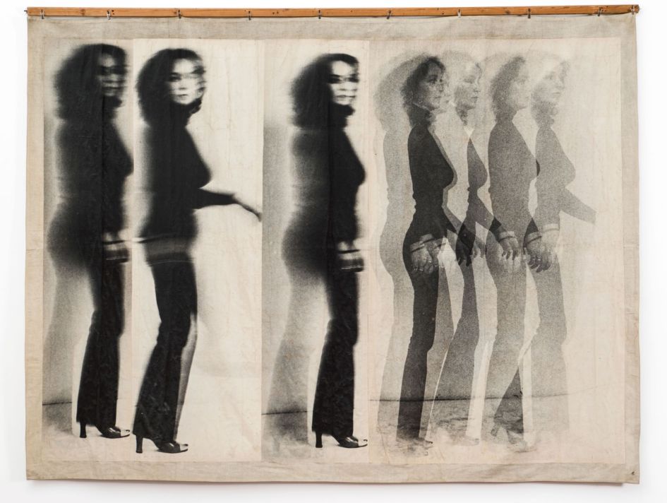 Rögtön a neoavantgárd utáni első termet egy nagy méretű munka uralja, amelynek létrejötte elképzelhetetlen lett volna fotós beavatkozás nélkül. Holott a terem fő hívószava a korszak anyagkísérleteinek egyik központi eleme, a textil. A nyugat-magyarországi Velemben a Textilművészeti Alkotóműhely a szombathelyi nemzetközi textilkiállításokkal együtt tág teret biztosított az iparművészet képzőművészetté avanzsálásának. A mozgalom egyik kulcsszereplője, Gulyás Kati ekkor a Kispesti Textilgyárban dolgozott, hozott textilmintákat kellett gépiesen másolnia. Csömörét fejezte ki a kiállításon látható Mozgás - Mozdulatlan mozgás II. című, 1979-ben készült munkájával, amelyben az eredetileg nagy tekercsben tárolt, ipari felhasználásra váró vászonra önmaga egész alakos fotóit ragasztotta fel úgy, hogy minden beállítása a kilépés, az eltávolodás, a szocialista textilipar robotmunkájából való menekülés üzenetét sugallja.