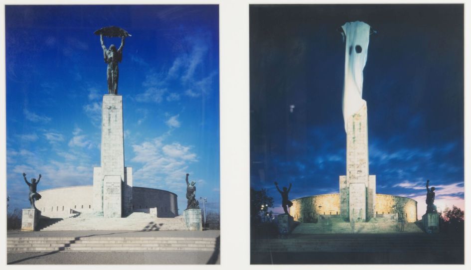 Szentjóby Tamás már röviddel a rendszerváltás után látványos akcióval bővítette tovább a művészet hatósugarát a köztér felé. A gellérthegyi Szabadság-szobor beburkolásáról készült fotókat nézve egy mai, fiatalabb látogató könnyen hiheti, hogy ezek szoftverrel készített, manipulált felvételek, holott a fotók az itt-és-most helyzetet dokumentálták. De megint nem csak dokumentálták. A paszpartuzott, keretezett, műtárggyá előléptetett fotók álomszerű - bár valós - látomások a szabadság lelkéről, kiáradásáról, arról a bátorságról, amellyel az akcióművész mindenki számára élővé, megélhetővé, aktuális jelentéssel felruházottá, könnyed, isteni nőalakká varázsolta a monumentális és ambivalens üzenetű szobrot.