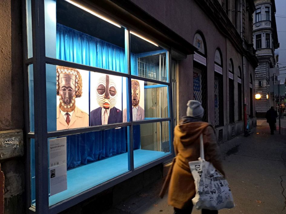 EC: Soha nem jártam még Magyarországon, így Budapesten sem, de ez az eredetileg üzletkirakatként funkcionáló tér felkeltette az érdeklődésemet. Egy utcára nézői kirakat, ahol az elhaladók a képekkel találkozva úgy érezhetik, mintha figyelnék őket. Az installáció tere védelmezi a képeket, miközben biztosítja láthatóságukat. Hangsúlyozza a portrék kettősségét, amelyek első pillantásra a múltat idézik, de a mában is együtt élnek velünk. Fontos momentum a képek és a kint lévő emberek közötti kapcsolat, mert ez a társadalmi interakciót állítja fókuszba.