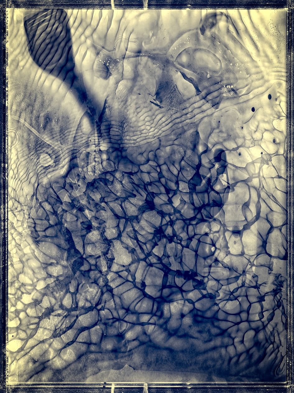 A Fényszendvicsötlete Herendi kettesével egymásra helyezett kontaktjaiból származott - ez alapján szervezte a projekt menetét. De milyen tanulság vonható le, ha követjük az eljárásmód általa megszabott mediális következményeit, és egymásra olvassuk a jelenségeket? Nem akarom bagatellizálni, hogy a kő-papír-olló esete, de az anyag nehézkedését követve mégis valami hasonló. Világos, hogy nem csupán esztétikai hatások összesimítása történik a képeken, a végeredmény annál jóval intenzívebb hatásfokon működik: törekvések egymásnak feszülése áll elő, amelyben a képi jellegzetességek felerősítik vagy éppen gyilkolják egymást. A minimál esztétikai rendezőereje a részletek rejtett strukturált finomságának bemutatására törekszik, a konceptuális tendencia viszont a szekvencialitás felé tart, az elrendezések logikai viszonylatait tárja fel, míg a kemogramok amorf, szabadjára engedett burjánzása a faktúrák mélységével és sűrűségével tölti fel a fényjáték és a vizes közeg könnyedségét. A kemogramok sűrű materialitása egyértelművé teszi, ami önmagában is jelentős, csak hajlamosak vagyunk átnézni felette. Ugyanis sem az üvegre exponálásnak, sem a vízmozgás rögzítésének nem egyedüli tárgya az üveg vagy a víz, hanem legalább ilyen jelentőséggel tárgya a vegyi anyagok találkozása.