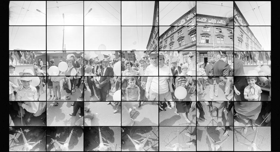 Ugyanebben a térben jelennek meg Hámos talán legismertebb, eddigi munkásságát végigkísérő, úgynevezett „felezős” képei, amelyek a környezetben talált, a fényképezőgép által rögzített montázsszerű beállítások. A kamera keresőjének képmezője által keretezett látványok felezővonalát valamilyen környezeti-architekturális tengely jelenti. A montázs, mint képiség és jelentés egymásmellettiségének eszköze kiemelt hangsúlyt kapott a hatvanas-hetvenes évek avantgárd képzőművészei körében, elsősorban Erdély Miklós 1966-ban írt, fontos hivatkozási ponttá vált Montázséhségcímű tanulmánya révén,3amely a montázsra nem technikaként, hanem tudományelméleti problémaként, az interdiszciplinaritás metaforájaként tekintett. Hámos a sorozat első darabjait is ebben a szellemben, a világ összetettségének megmutatása céljával hozta létre: a felezővonalak mentén kettéosztott képek eltérő vizuális minőségek találkozására mutatnak rá, amelyek egyúttal a jelentés szintjén is megfigyelhető párhuzamosságokat, kettősségeket (például a villamos statikus belső tere és a folyamatosan változó utcai valóság feszültségét) példázzák. A kiállításon a korai képek mellett szereplő 2020-as Cipők a Duna-partoncímű „felezősök” Pauer Gyula munkáját középpontba állítva a köztéri emlékművek szerepére kérdeznek rá, aláhúzva az elmúlt ötven év munkásságának folytonosságát is.