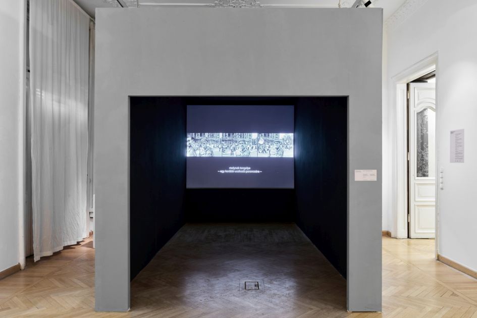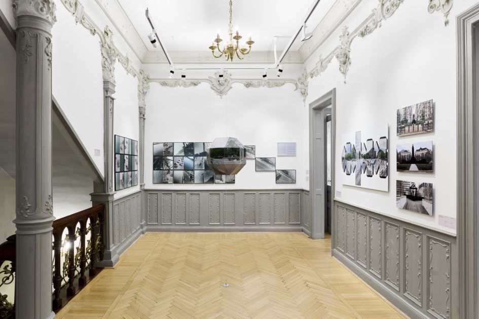Az emeleti kiállítótérben nagyobb hangsúly kerül Hámos Pratschkéval közös alkotói tevékenységére: a 2024-es Építkezés a föld alatti parkoló bejárata előtt, illetve Gyepsarok a föld alatti parkoló bejárata előttcímű munkák a - Hámos korai művei esetén is hangsúlyossá váló - tér-idő problematikát helyezik fókuszba. A fotók az egyéni és kollektív emlékezet kérdéseit urbánus és publikus terek történetein keresztül járják körül. A látás multiperspektivikus rekonstrukcióján alapuló képegyüttesek - Hámos 1970-es évekbeli analitikus attitűdjét folytatva - kiterített gömbszerkezetként vagy térben megvalósított fotóobjektként jelennek meg. A fotóobjekt nem csupán egy gömbperspektivikus térkonstrukció kicsinyített mását, de tér és idő egy pontba sűrítésének tárgyi megvalósulását is jelenti.