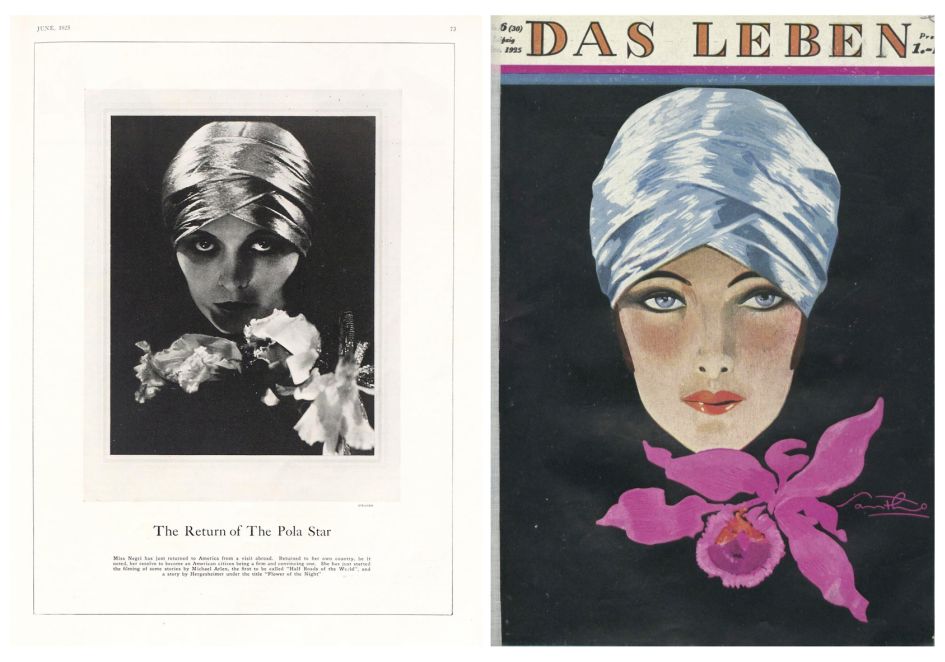 Pola Negri ekkor már igazi sztár volt az Egyesült Államokban, amit abból is lehetett tudni, hogy Edward Steichen készített róla portrét, akit akkoriban „a legnagyszerűbb élő portréfotográfus”-nak neveztek. Steichen 1923 és 1936 között a Vogueés a Vanity Fairvezető fotográfusa volt, a magazinokban több száz portréja jelent meg olyan hírességekről, mint Charlie Chaplin, Gary Cooper, Greta Garbo és Bánky Vilma. Steichen egyik, Negriről készített portréján a színésznő feje a teljesen fekete háttérből tűnik elő; homlokát és haját egy kendő fedi; tekintete élesen vetül a nézőre, szemeit pedig még inkább kiemeli a körülöttük lévő sötét árnyék. Az erőteljesen kontrasztos portrén Negri arca előtt, a kép alsó harmadában, virágokat formáló díszek vannak. (Az eredeti felvétel jóval kevésbé kontrasztos; a háttér semleges, szürke színű, és az is jól látható rajta, hogy Negri bundát visel). A felvétel a „Pola Sztár visszatérése” képaláírással jelent meg annak alkalmából, hogy a színésznő egy rövid külföldi út után visszatért az Egyesült Államokba.38