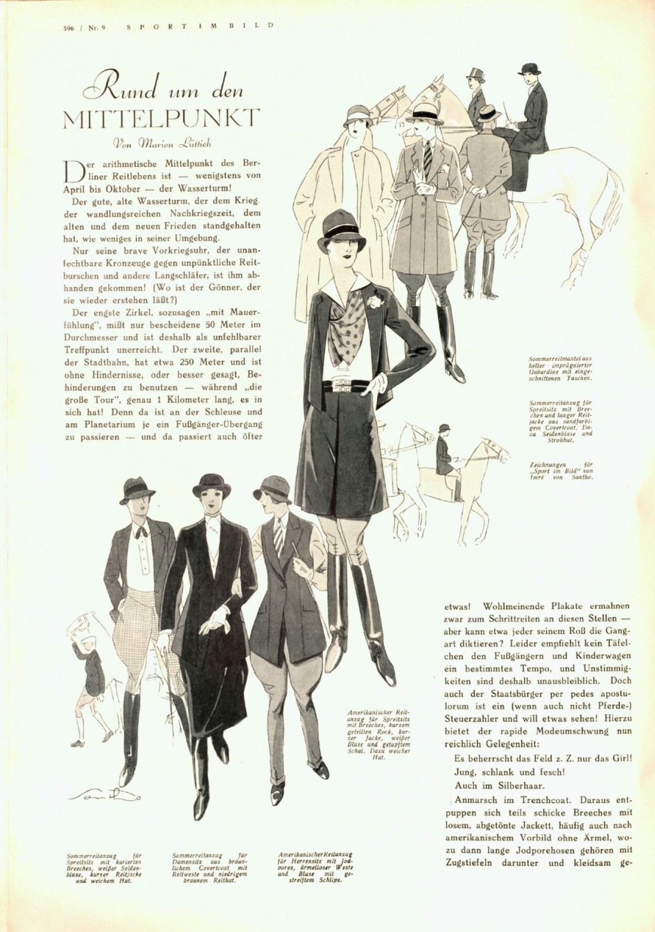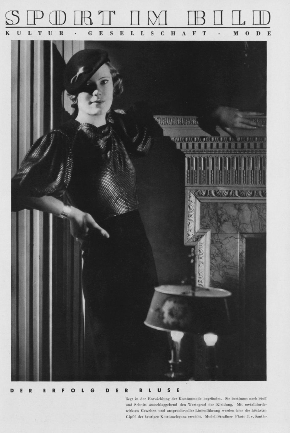 A magazinok nagy hangsúlyt fektettek a divat bemutatására, mivel az öltözék a nagyvárosi élet és az egyén egyik kifejezésmódjává vált. A divatrajzok aranykora az 1920-as évekre esett, a művészi rajzok pedig gyakran nem részletekbe menően ábrázolták a ruhákat, hanem inkább egyfajta atmoszférát mutattak be. Az évtized második felében azonban a grafikák, rajzok, illusztrációk és szövegek helyét egyre inkább átvették a fényképek; az első, címlapon megjelent fotó éppen Steichen nevéhez fűződik, 1932-ből.40Santhó ugyan éppen abban a két műfajban - irodalmi illusztráció és divatrajz - alkotott, ahol megmaradt a rajz jelentősége, és a német magazinokban továbbra is sok szerepelt belőlük, a Weimari Köztársaság évei során mégsem jelent meg sok munkája. A már említetteken túl 1926 és 1932 között összesen nagyjából harminc rajza lelhető fel: a Berliner Leben, a Sport im Bildés a Revue des Monatslovaspólóhoz, motorsporthoz és síeléshez kapcsolódó alkotásokat, illetve divatrajzokat közölt tőle. Emellett két ifjúsági könyvben is szerepeltek tőle illusztrációk: Brigitte von Röder 1930-ben megjelent Helga studiert, és Else Hinzelmann 1932-es Bärbel kommt in die Stadtcímű könyvében.