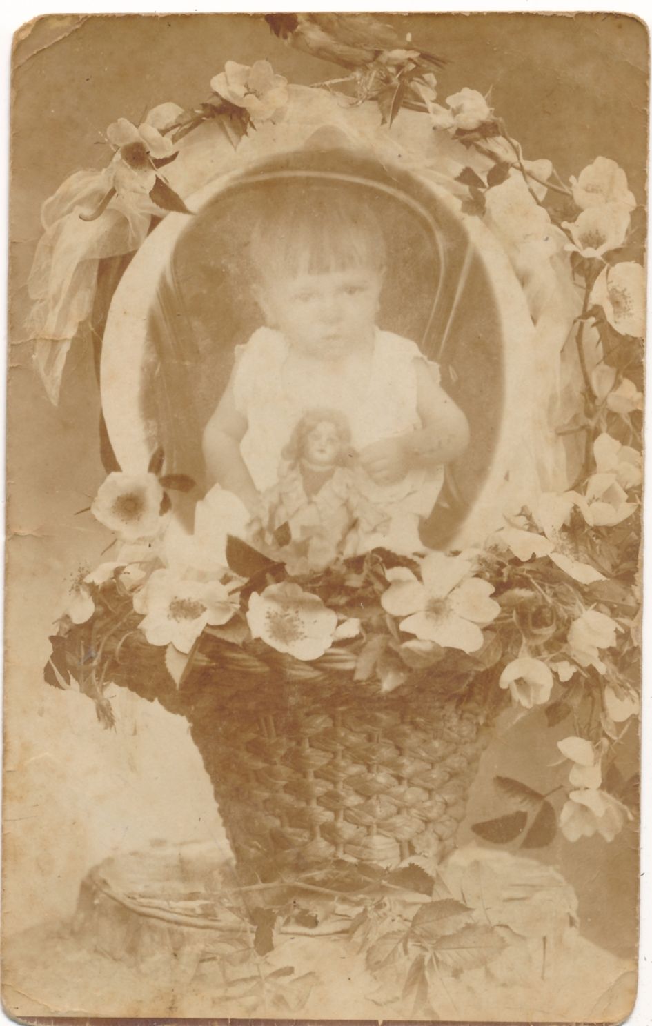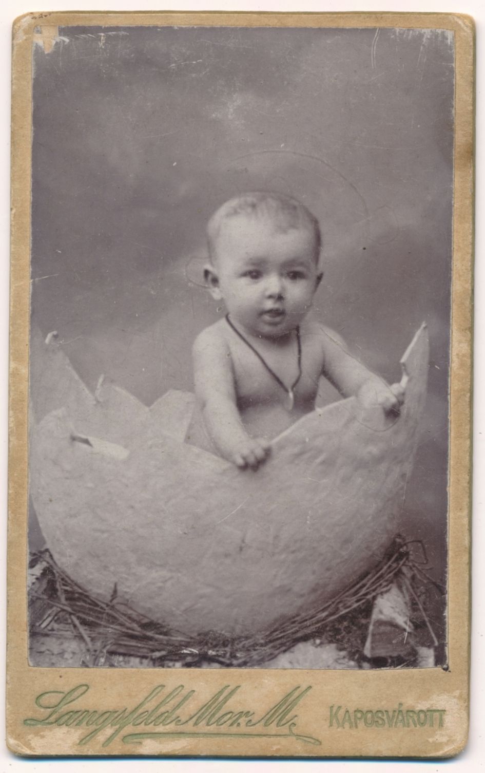 Langsfeld Mór (Kaposvár) papírtojásban ülő, Regetzky Ferenc „gyorsáru” feliratú képe viccelődésként ritkaságnak tekinthető. (8‒9. sz. kép) Ez utóbbi Borsos Eszti kislányt ábrázolja 10 hónapos korában 1898. augusztus 8-án. A levelezőlapok korában az említett minták alapján postán küldhető variációk sorozata alakult ki, melyek tobzódtak a szimbólumok felidézésében. Az egyik képen a fészket helyettesítő kosár fölött eszményítő keretezést is alkalmaztak. (10. sz. kép) Ebben az esetben egy fényképet emeltek piedesztálra, melynek virágokkal való keretezése utalhat a gyermek elvesztésére is. A kép helyettesítette a gyermeket, mely ilyen formán örökké megmaradt. A rekvizitumok így egyesítik a születést és a halált, segítik az emlékállítást, a trauma feldolgozását. Ellenkező előjelű a másik kép, mely amatőr szinten fogalmazta meg a születés toposzát. A kosárban ülő gyerek beállított, de szabadban készült amatőr felvétel, mely azt az utat mutatja, ahogyan az egykori szimbólumok eltűnnek, átalakulnak a megörökítés rutinjában. (11. sz. kép)