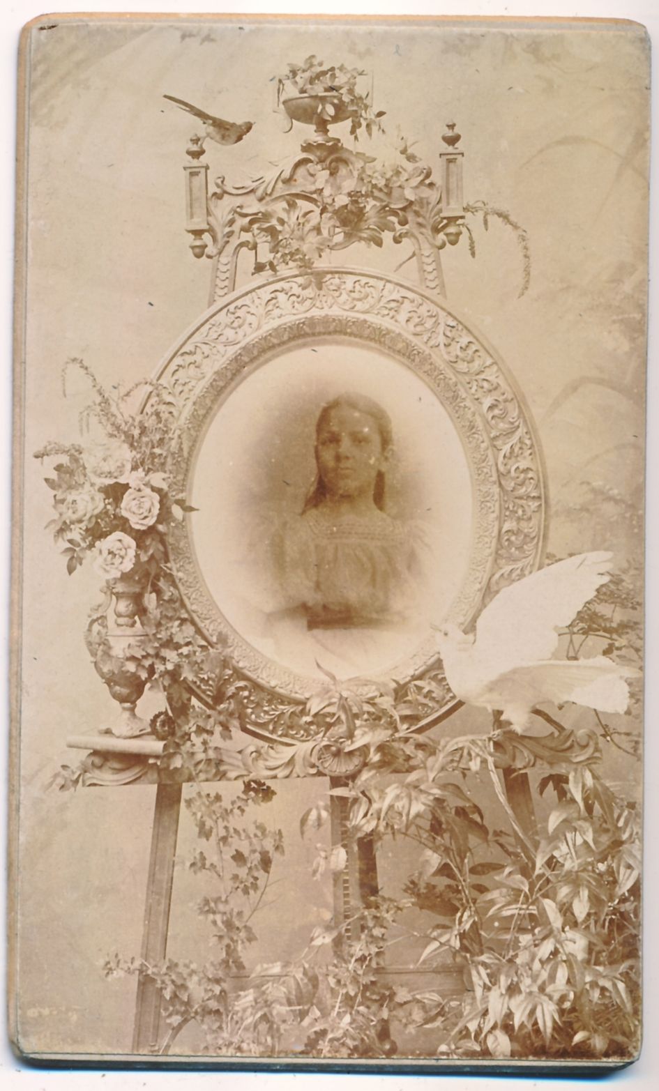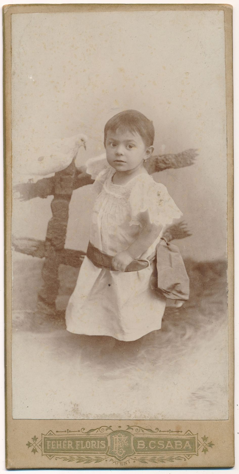 Az érdekesnek vélt ábrázolások szintjén maradva, megemlíthető Fehér Flóris képe egy kislányról, aki kitömött fehér galambot tart a kezében. A szimbólum ebben a kontextusban pusztán csak a gyermeki ártatlanságra utal, egykori keresztény értelme (a szentlélek jelképe) elveszett. (12. sz. kép) A ritka tárgyakat alkalmazó fényképészről nem tudunk túl sokat, bár a századvég első jelentősebb fényképészeti műtermét tartotta fenn Békéscsabán, 1880 és 1904 között.7 1898-ban műtermének áthelyezési hirdetése jelent meg a helyi újságban, melyben arról tudósította a közönséget, hogy a Knak-féle házból a volt Laszky-féle aradi ipar és népbank emeletes ház udvarába költözött, „melyet csinosan és új gépekkel látott el.” Készített képeket életnagyságú, élethű fényképtől kezdve a legkisebb formátumú fotókig, s azok kivitelezésére kiváló gondot fordított és ár tekintetében is a legversenyképesebbnek tartotta magát.8