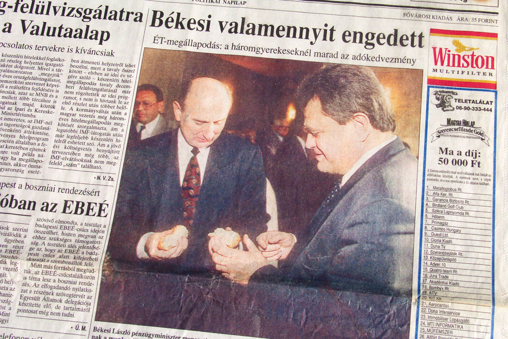 Itt ez a kép, Széles Gábor elfelezi a pogácsát Békesivel. A szerkesztő nagyon dögös képaláírást adott: Békesi megosztja a pogácsáját Széles Gáborral, de mit kap a munkavállaló. Akkor az sütött, és fölhívtak, gratuláltak, találkoztam kollegákkal, és mondták, hogy milyen jó kép volt, de ma már nincs jelentősége a dolognak. Sokat kell magyarázni, mert már arra sem emlékeznek, hogy éppen akkor szüntette meg Orbán Viktor az Érdekegyeztető Tanácsot. Most valami más neve van, de nem működik a dolog. Tehát túl sokat kell magyarázni, hogy a kép süssön.
