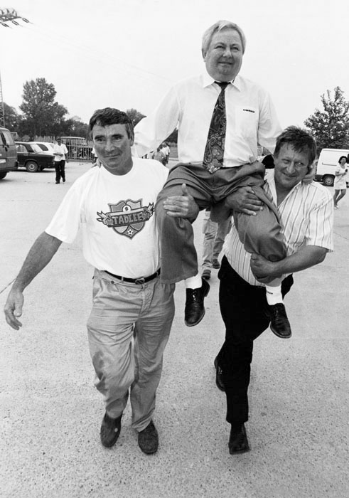 - Hát, az egy más dolog. Az egy poén, vagy nem tudom micsoda, de a másik, az nem egy poén, hanem a kőkemény valóság. Annak kapcsán volt olyan is, aki azt kérdezte, hogy ezt hogyan sikerült beállítanom. Amikor odamentem a budapesti közgyűlésre, tudtam, hogy olyasmit kell csinálni, amiből kiderül, hogy ellentét, feszültség van a két párt között. Ott álltam másfél órán keresztül, néztem a fényképezőgépbe, és vártam ezt a pillanatot. Egyébként is érdekes dolog, hogy azt gondolják az emberek, még a sajtószakmában lévő emberek is, például az én főszerkesztőm, hogy odamegy a fotós, megnyomja a gombot, és kész a kép. Ahhoz, hogy egy ilyen képet meg tudj csinálni, fizikailag is nagy terhet kell vállalni. Ha az ember tényleg gondolkodik, akkor ott az eseményen először is állandóan oda kell figyelnie, követnie kell, hogy miről beszélnek. Ki kell találnia valamit, hogy hogyan lehet a hallottakat megfogalmazni képben, ami azért nem könnyű dolog. És utána várni kell a pillanatra, hogy amit sikerült kitalálni, az képpé formálódjon. Tehát fizikailag és szellemileg is roppantul megterhelő dolog. Egy, másfél óránál tovább nem is lehet csinálni. Ezt azért mondom, mert az ember azt gondolná, hogy egy riportfénykép egy ezredmásodperc alatt elkészül. „Csak meg kell nyomni a gombot, a többi a mi dolgunk." Nem így van, végtelenül megterhelő a dolog.