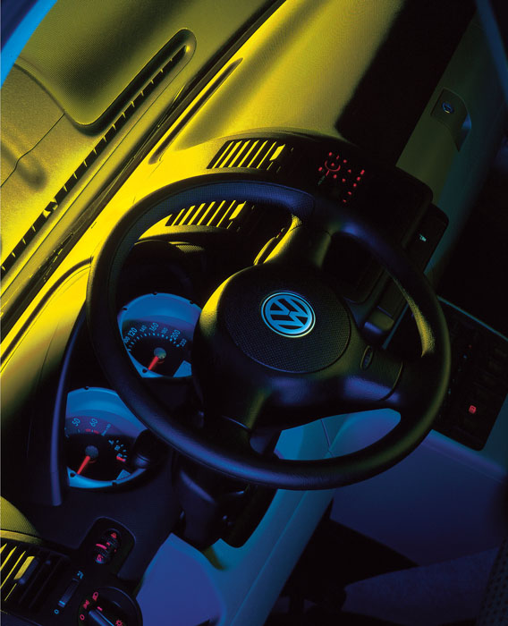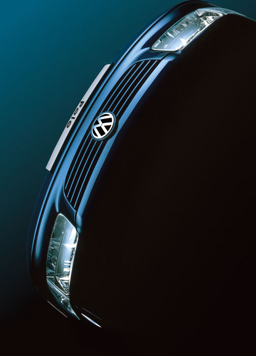 4. kép: A fotó a VW Magazin megbízásából készült. A kamerabeállításnál arra törekedtem, hogy a felvétel ne hasonlítson a gyári műszaki fotókra, de címlapról lévén szó, a képnek kellő dinamikája legyen, és maradjon annyi hely, hogy a szokásos szöveges információkat elhelyezhessék. A világítás Broncolor stúdió vaku többszörösen szórt fénye