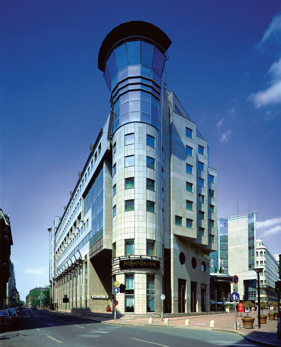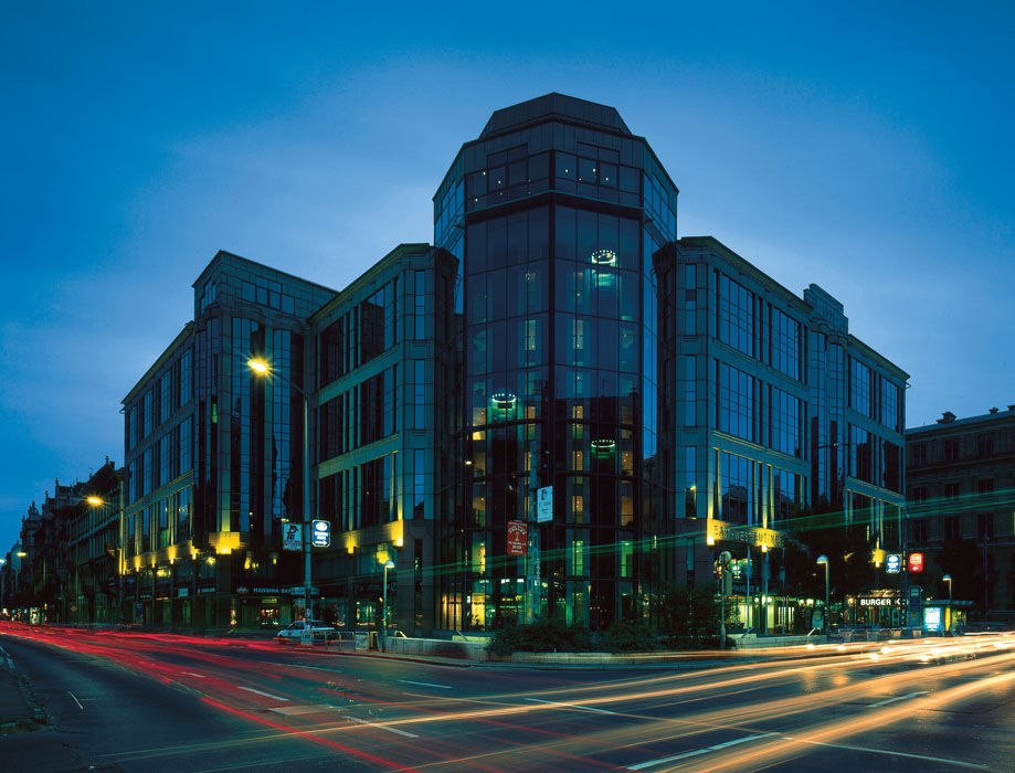7. kép: Hotel Kempinsky. Budapest újabb épületeit bemutató könyv illusztrációjaként készítettem ezt a felvételt. A nagyon merev képi megfogalmazás nem akar túllépni a műszaki fényképezés keretein. A fotó Sinar kamerával, 8x10 inch (20x25 cm) méretű fordítós filmre készült