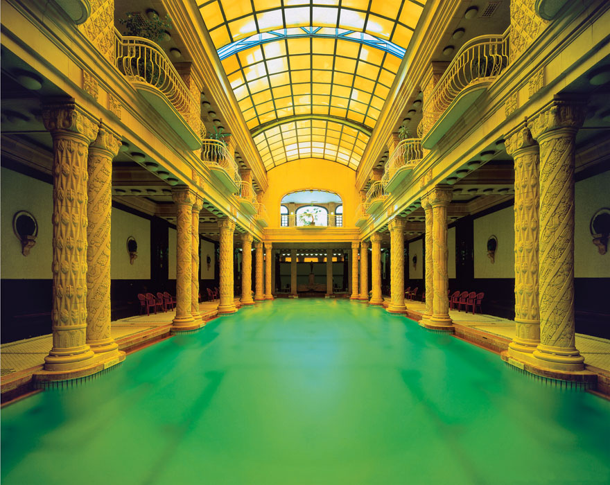 9. kép: Gellért-fürdő. Budapest nevezetességeit bemutató könyvhöz készítettem, Sinar kamerával, 8x10 inch méretű fordítós filmre. Ahogyan várható volt, a napfény filmen a meglehetősen hosszú - 4 perces - expozíciós idő érdekes színhatást eredményezett