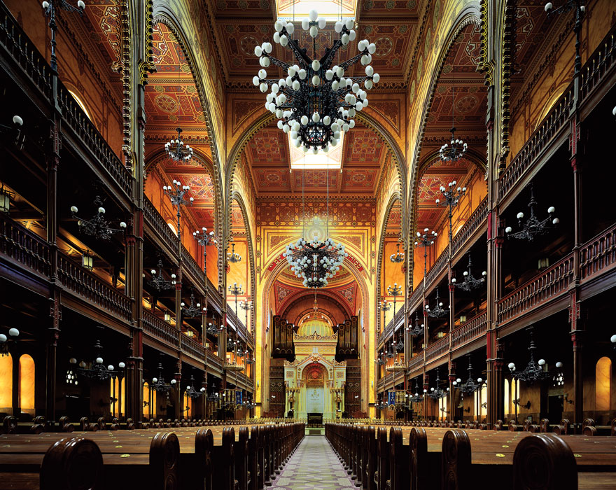 10. kép: A Dohány utcai zsinagóga. Belső terek fényképezésénél gyakori probléma, hogy a megvilágítást adó fényforrás is rákerül a felvételre. Ebben az esetben a nagyon hosszú (45 perces) expozíciós idő és a nagyméretű nyersanyag használata lehetővé tette, hogy korrigáljam az ilyenkor fellépő hibákat. A kép Sinar 8x10 inches kamerával, színes fordítós filmre, a kompakt fénycsövek színhőmérsékletének beállításához két szűrő kombinációjával készült