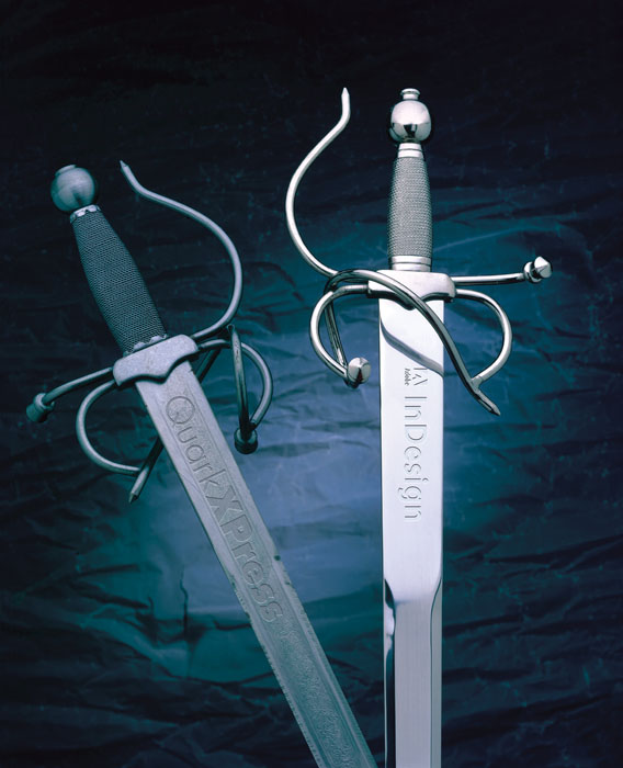 11. kép: Az Almalap címlapjához készült, az InDesign program megjelenése alkalmából. Várható volt, hogy ez az új szoftver és a QuarkXPress majd megküzd egymással a piacon, bár ezt a várakozást az idő nem igazolta. A felvétel 8x10 inch (20x25 cm) negatívra készült. A két program nevének elhelyezése a két pengében számítógépes manipuláció eredménye