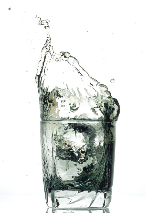 12. kép: Hirdetés és poszter céljára készült. Az ügyfél itt is azt nehezményezte, hogy - a képen ábrázolttal szemben - ők nemcsak egyféle poharat forgalmaznak. Kamera: Sinar p2, méret: 4x5 inch, film: nagy színtelítettségű diapozitív. A felvétel során szükség volt egy kis kamerabeállítási trükkre, mivel a fizika törvényei a stúdióban is érvényesek