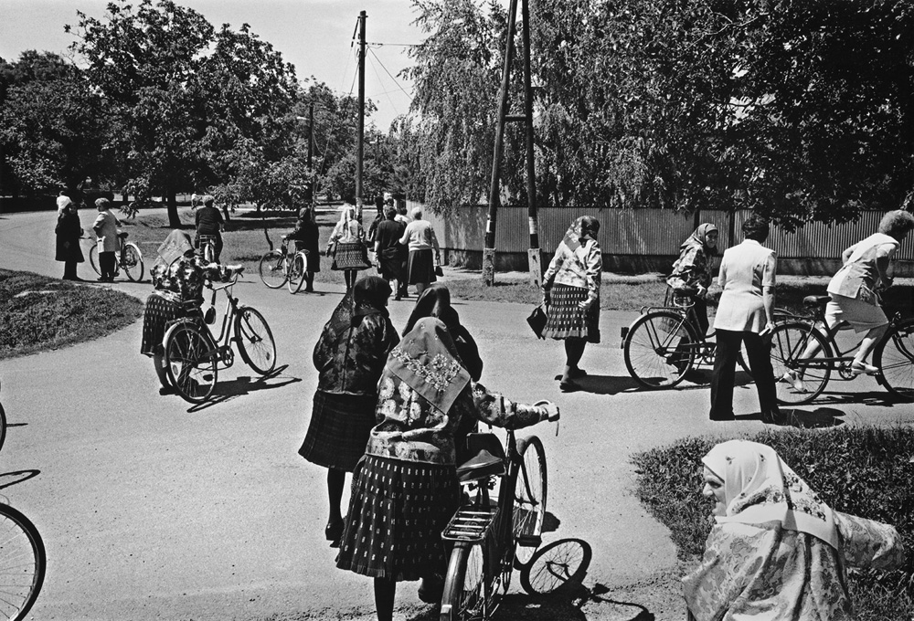 Domaniczky Tivadarnál az a döbbenetes, hogy ugyanaz az ember fényképezte az összes felvételt. Van, amelyik egyértelműen ’81–’82-es Jokesz-kép. Vannak olyanok is, amelyek a késő hatvanas vagy a nyolcvanas éveket idézik. A Boldogot áb-rázoló viszont a harmincas vagy ötvenes évek világát sugallja. Ez teljesen megdöbbentett, ez nem lehetett véletlen. A Néprajzi Múzeumban volt ugyanis egy kiállítás Boldog falu mediális feldolgozásáról a múlt század elejétől napjainkig. Ott kiderült, hányfajta használata van a fotónak. Az egyik a Balogh Rudolf-féle fényképezés, egyfajta falukutatás. Domaniczky képe hihetetlenül beleillik abba a sorba. Mint egy néprajzi fotó, amely azt akarja ábrázolni, hogy az ötvenes évek elején mindenki népviseletben és biciklivel megy valami gyűlésre, és ez milyen vicces. Aztán kiderült, hogy itt tényleg egy összejövetelről van szó, de sokkal inkább ma, mint negyven évvel ezelőtt. De megjelenik egy férfi is, aki sehogy sem illik bele a képbe, és ettől az egész delíriummá kezd válni.