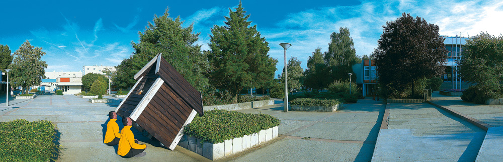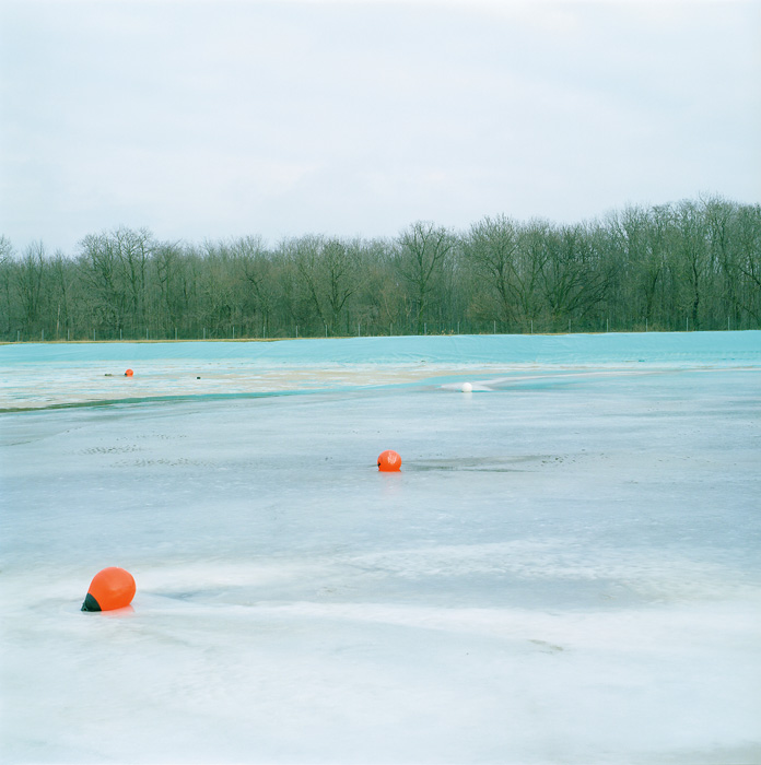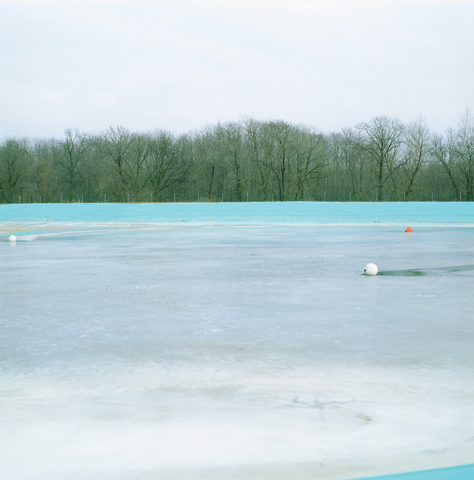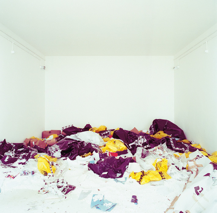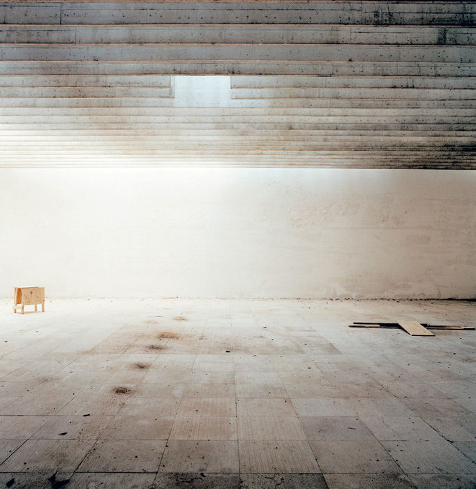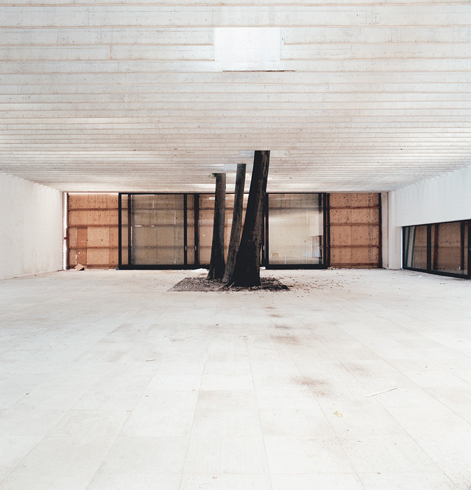 Lukas Schaller négy enteriőr képe mindegyikét ,,ugyanabból’’ a nézői/fotós pozícióból fotózta; négy fallal határolt doboz-tereket látunk, ahol a falak találkozási vonalainak enyészpontja a kép közepére lett szerkesztve. A művész a velencei Giardiniben található nemzeti pavilonokról készített képeket – abban az időszakban, amikor a biennálék között éppen nem használták azokat. S igen markánsan jelenik meg a képeken, hogy mennyire elhagyatott lehet egy tér, amelyet alkotói, használói felednek el éppen. Az első képpár üres tereket ábrázol: az egyik fotón a három, mennyezetet átfúró fa sem bontja meg a csarnok geometrikusan egyszerű terét, sőt, barna törzsük részévé válik mértanias tagolásának; a másikon mindössze két tárgy vész el a tágas térben, amelynek sötétjét s így a kontúrokat is a mennyezet és a hátsó fal találkozásának sávjából beszűrődő fény oldja némiképp. A második képpáron furcsa játék tanúi is vagyunk: az egész termeket betöltő, fehér laticel golyó-halmok első ránézésre havas tájra emlékeztetnek az enteriőrökben, s ezekben hevernek egymásra hányva, összevisszaságban a csomagolóanyagok, a korábbi installálások kellékei, magyarán: a szemét. Semmi extra; csak képek helyekről, amelyekről így még nem gondolkoztunk el. S amelyek ráadásul az ember egyik megkülönböztető sajátosságának, a kultúrának, azon belül is a művészetnek ,,templomai’’, különlegesen rangos, kiemelt helyszínei évről évre – néhány hónapig legalábbis. Most mégis jellegtelenül láthatók, mint bármilyen épületek, bárhol a világon. Mint bármilyen díszlet, amit az ember különféle tevékenységei és szükségletei számára alkotott, hogy aztán kérdés nélkül hagyja magára, ha nincs szüksége rá.