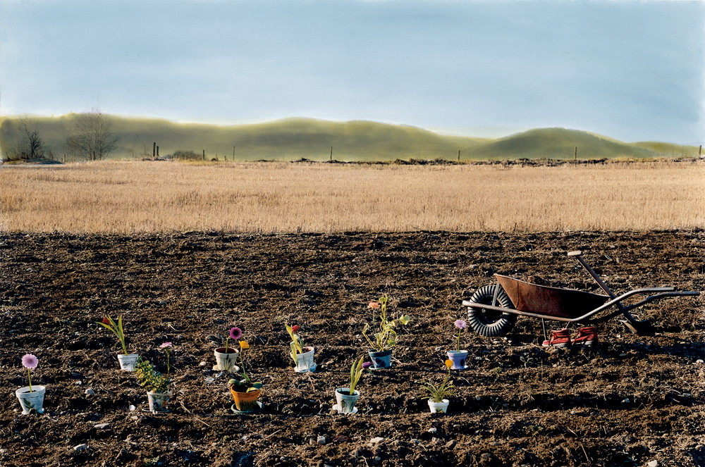 A fotós humorára és játékosságára jellemző, hogy nem elégszik meg ennyivel: még egy szép, patinás csillárt is függeszt az asztal fölé – tökéletes berendezés. A tárgyak, bútorok kapcsolatba lépnek egymással a befogadás során, viszonyrendszerbe kerülnek, aurájuk szoba falait emeli maguk köré. Egy másik fotón kávézósarkot rendez be, az asztalon a zsömléből már hiányzik egy falat, s mivel hideg van (egy havas mezőn vagyunk éppen), hát logikusan ott a radiátor is. A hátteret itt egy sárga, piros virágos takaró adja, s ennek felelgetnek az asztal körül kinövő, színes apró virágok is – jelenlétük egyszerre furcsa a hideg miatt (bár ezt még magyarázhatja, hogy talán a ,,szoba’’ melege segít nekik), de ráadásul vágott virágokat látunk, finoman utalva így az önmagától létrejött és a ,,gondozott’’ közötti különbségekre is… Egy másik, immáron teljesen hófödte mezőn egy színes, virágos, és további textil virágokkal kivarrt takaró fekszik – s hogy ne legyenek illúzióink, mit is látunk valójában, a háttérben nyugodtan hever a locsolócső. Itt (is, többek között) az évszakokhoz köthető tudásunkat, tapasztalatainkat hozza kicsit zavarba a művész… Az utolsó képen ismét jó idő van: egy szántóföld barázdái, a kertész épp csak, hogy kimehetett a képből: piros csizmája, eszközei gondosan összekészítve várják. Vagy csak az ő személyének, s ezen keresztül a szabad természet megdolgozásának szimbólumaiként vannak jelen. A szántóföldhöz alapvetően földműves személye illene: ám a barázdákba ültetett színes virágokról már önmagukban sem a mezőgazdaságra asszociálunk, s ráadásul helyes, színes kis cserepekben ücsörögnek egymás mellett… A vattaszerű világoskék ég alatt: itt vehető ki a legjobban, hogyan is fest bele a képekbe Samaraweerová. Ugyanis a művész egy-egy részletet (virágot, tárgyat, virágcserepet, hátteret) után-színez, s hozza így be a fotó manipuláltságának újabb dimenzióját, illetve teszi képeit még egy kicsit irreálisabbá, ezzel együtt festőibbé, sugárzó színűvé, élettelivé.