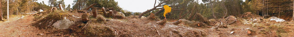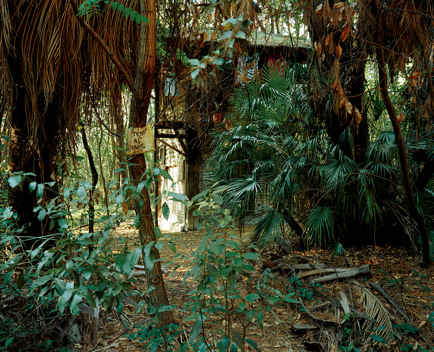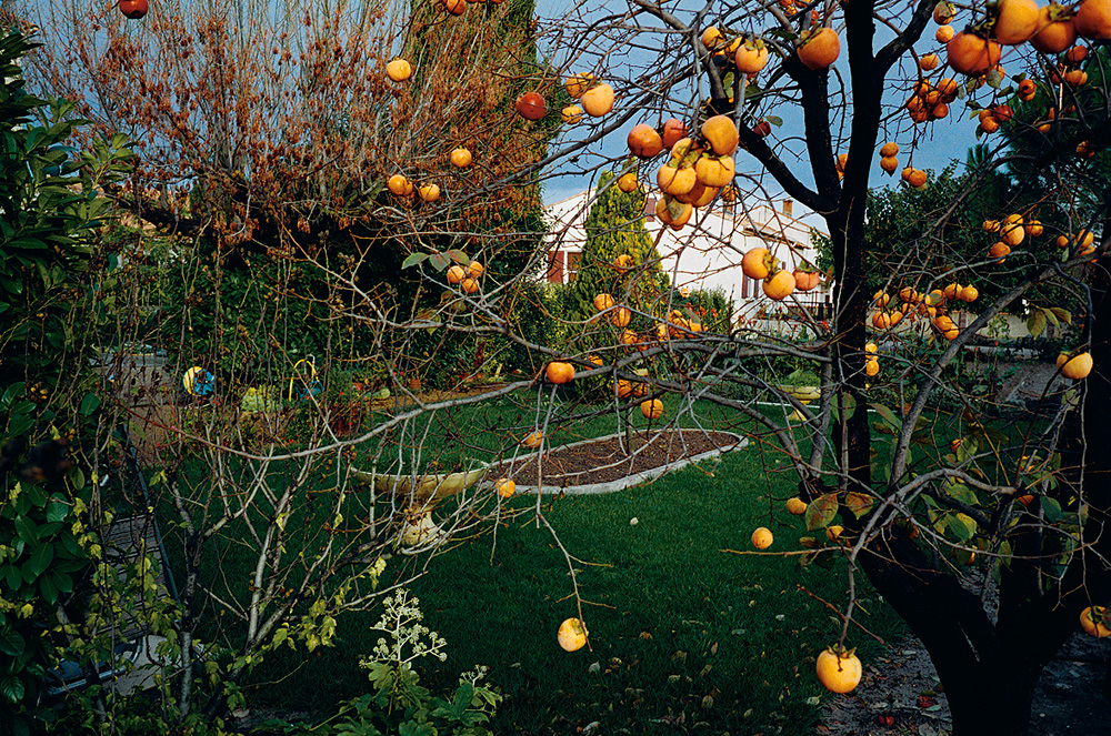 Veronika Hofinger szintén ,,készen talált’’ tájakkal dolgozott. Az ő tájképeinek képkivágatai azonban az előző munkákétól eltérően egészen közeliek, a fotós néhol szinte a térérzékelés lehetőségét is elveszi a nézőtől, ahogy kimetsz egy-egy darabot a természet (növény-) szövedékéből. S ráadásul nem egy – egyébként cseppet sem manipulált – fotón egészen sajátos látványt kapunk: szinte természetellenesen piros törzsű fák hálóján át látjuk az erdő többi részét, vagy apró házikót fedezhetünk fel a buja zöld növények sűrűjében, esetleg erőteljesen narancssárga gyümölcsöket mint lebegő pöttyöket látunk, amik alig kapcsolódnak faágaikhoz. Egy-egy fotó mintha elvarázsolt táj-darabokat vagy növényeket ábrázolna: s kézzelfogható környezetünk szintén kézzelfogható mesebeli részleteit tárja elénk.