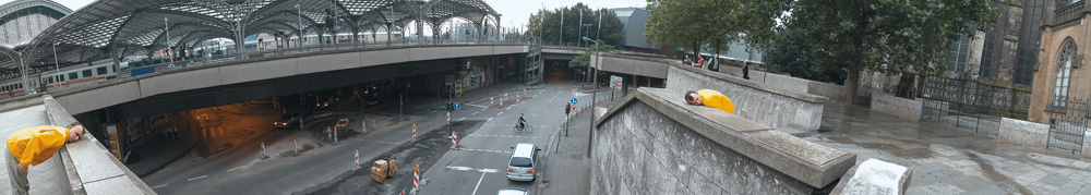 Koronczi Endre fotói szintén a realitás–irrealitás problémakörben mozognak, kiegészülve az álom és valóság kérdéseivel. A művész a több éve készülő Bianco-projekt részét képező, 100 képből álló sorozatából válogatva készített különleges installációt: egy felfüggesztett majdnem-egész hengerbe léphetett a látogató, s mivel ennek alsó széle lejjebb volt, mint az átlagos növésű ember szemmagassága, így a külvilág szinte teljes kizárásával nézhettünk körbe az elénk táruló panorámán. Amely ugyan különféle belső és külső tereken, tájakon készült fotókból állt össze, de az egyes képek összeérő szélei és a koherens képi világ miatt mégis egy látványt képeztek. A munkák mindegyike izzó színű, néptelen, mozdulatlan tájat tárt elénk – illetve a főszereplő (a művész) alakja jelenik meg csupán rajtuk, s nem is csak egyszer. A multiplikálás már önmagában kimozdítja a képeket a megszokott nézhetőségi pozíciókból, s ezt csak erősíti, hogy a citromsárgába és feketébe öltözött figura szinte kivétel nélkül rendhagyó, furcsa pozitúrákban tűnik fel: vagy citromsárga autója motorháza kapja be éppen, vagy érdekes kiegészítő elemként kapaszkodik fejjel lefelé egy házikó két oldalán. S a finom részletek külön is lenyűgözőek: több képen egészen apró háttér elemekben szintén a citromsárga színt vehetjük észre, ha alaposan körülnézünk az elénk tárt, sűrű, mégis kiegyensúlyozott panorámán. Mintha egy álom autonóm logikája szerint következő képkockáit sorolta volna egymás mellé-alá-fölé a művész.