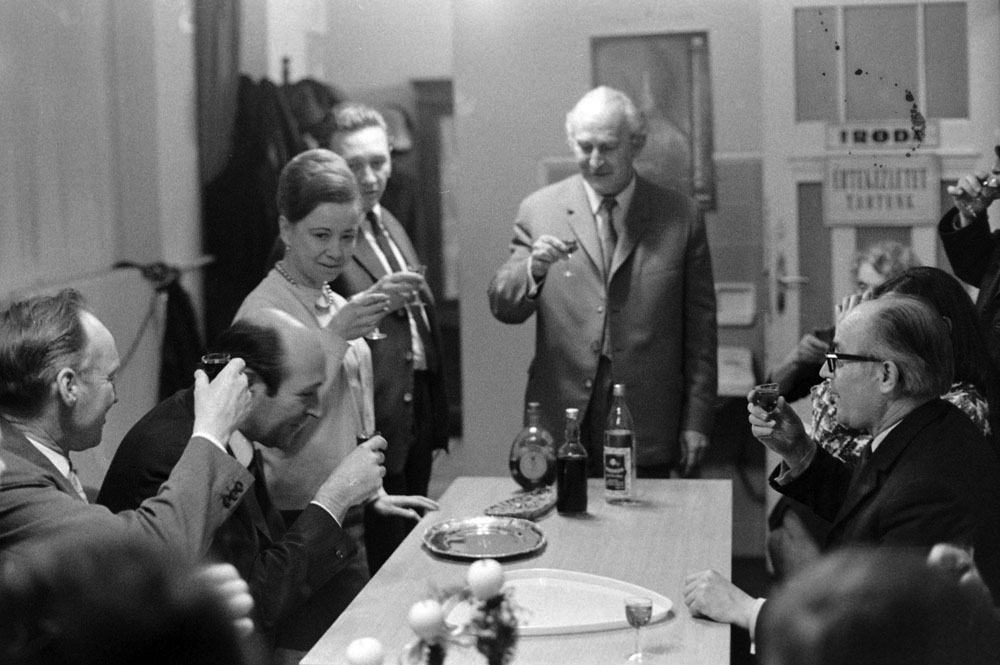 (4) A megnyitó után baráti társaság köszöntötte a művészt. Gál Imre, Rév Miklós, Topor Zoltán, Tomori Ede, Bilkei Gorzó Magdolna, ?, Kovács István Károly, Gál Imréné, Tomori Edéné, Fenyő Imréné, Kovács Tamás (félig takarva)