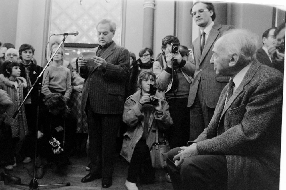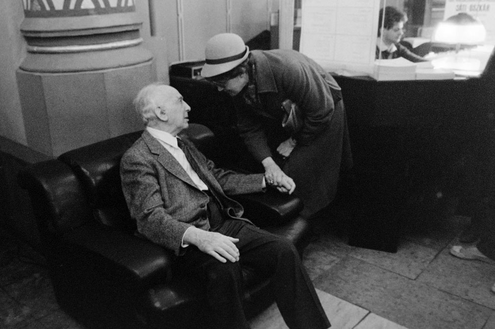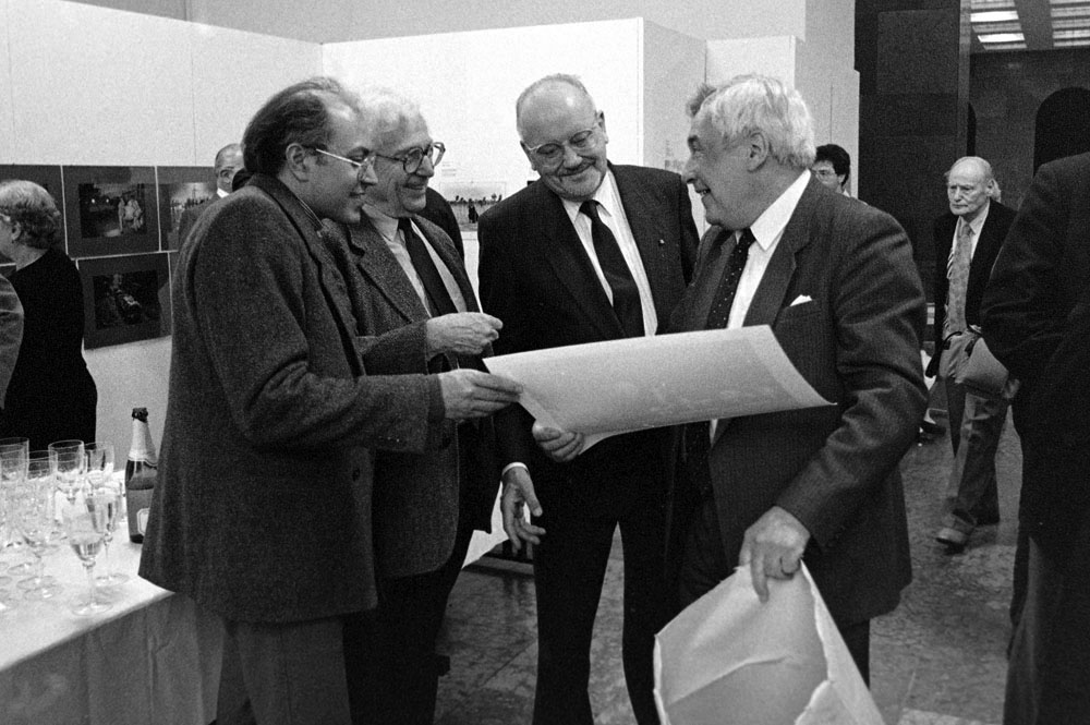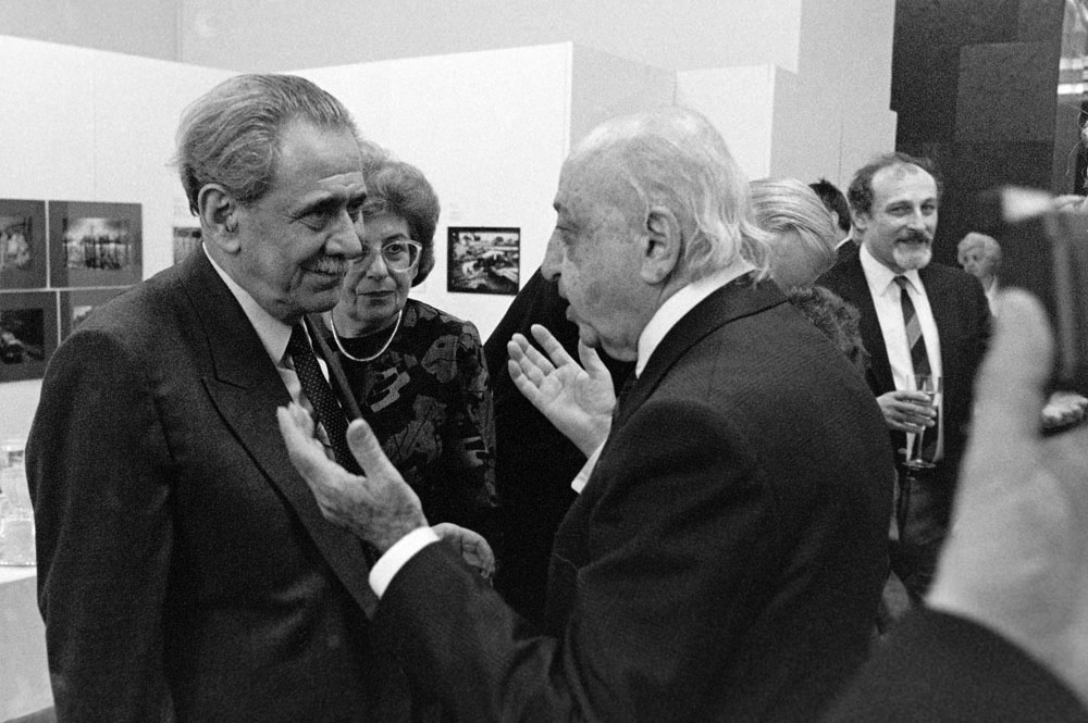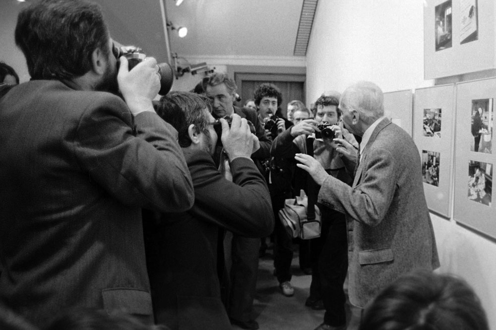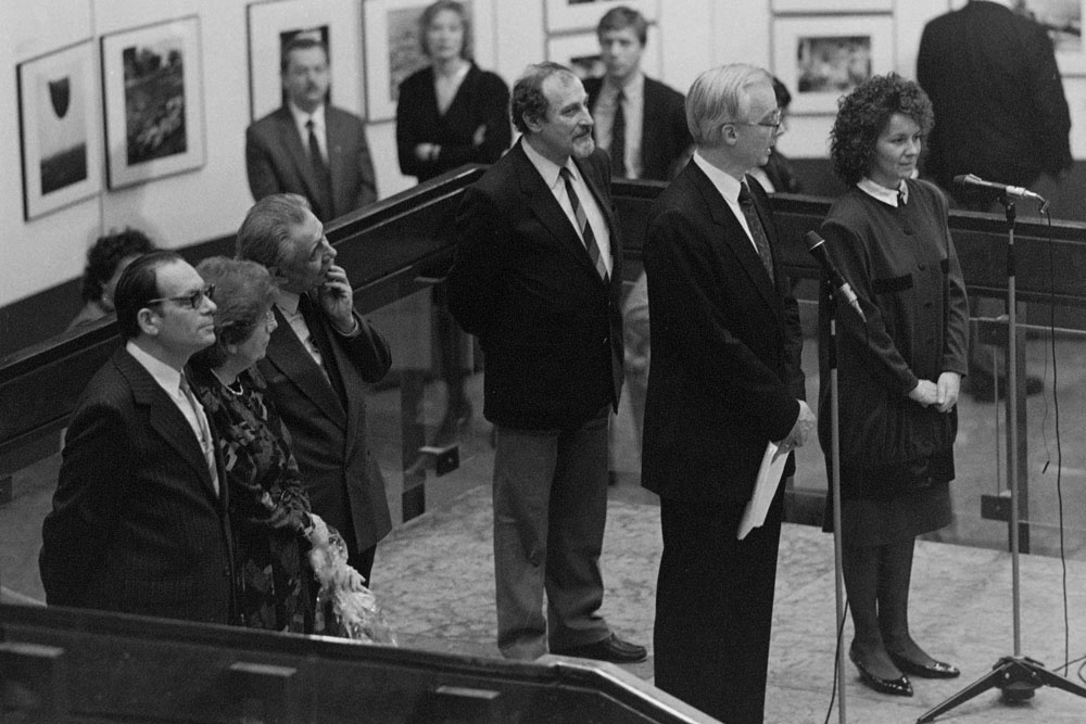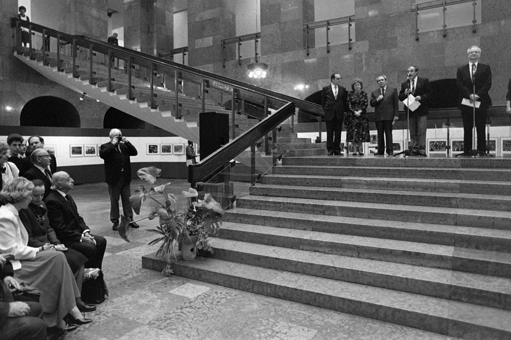 (5) A születésnapi Kertész-kiállítást Féner Tamás nyitotta meg a Vigadó Galériában. Középen Baricz Katalin (térdel), André Kertész, mögötte Borbély Károly, a Művészeti Alap igazgatója