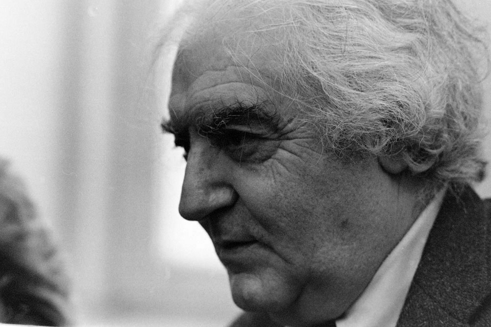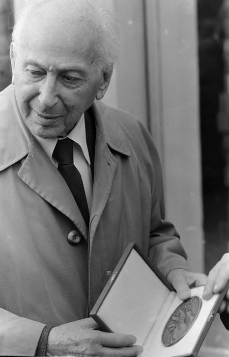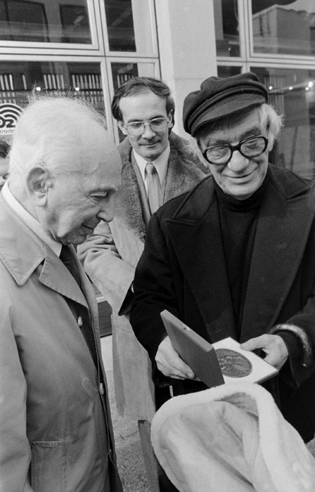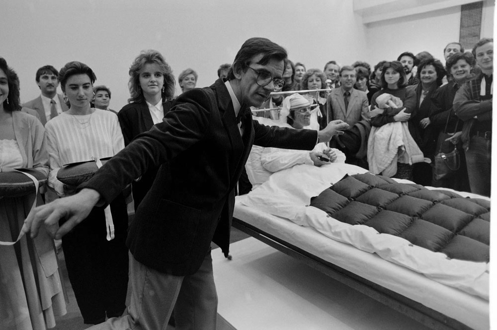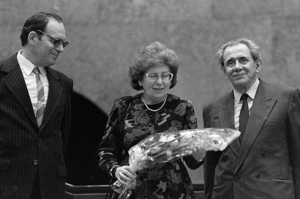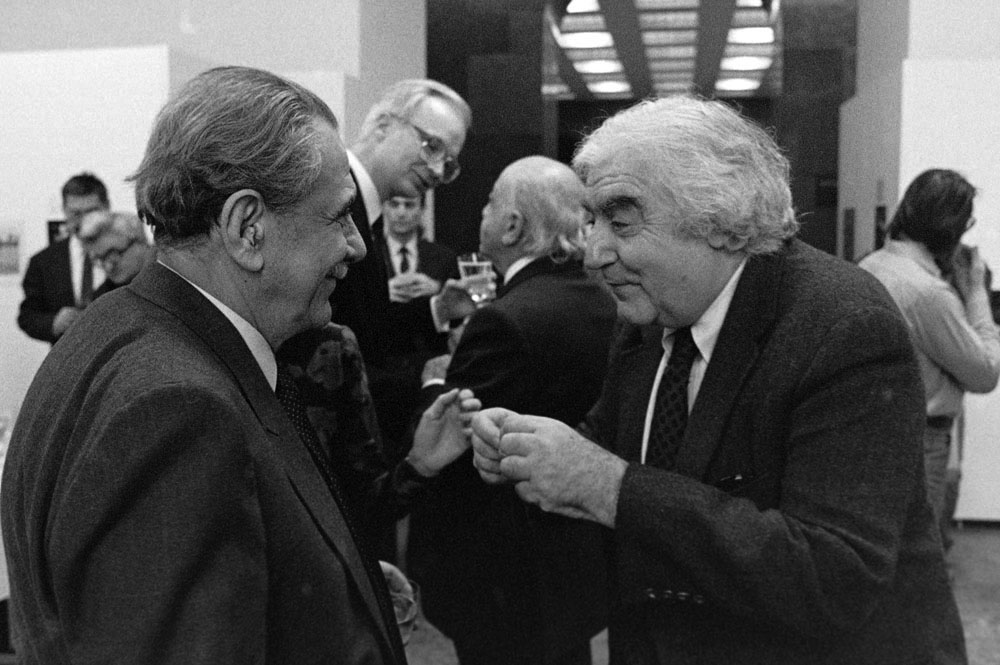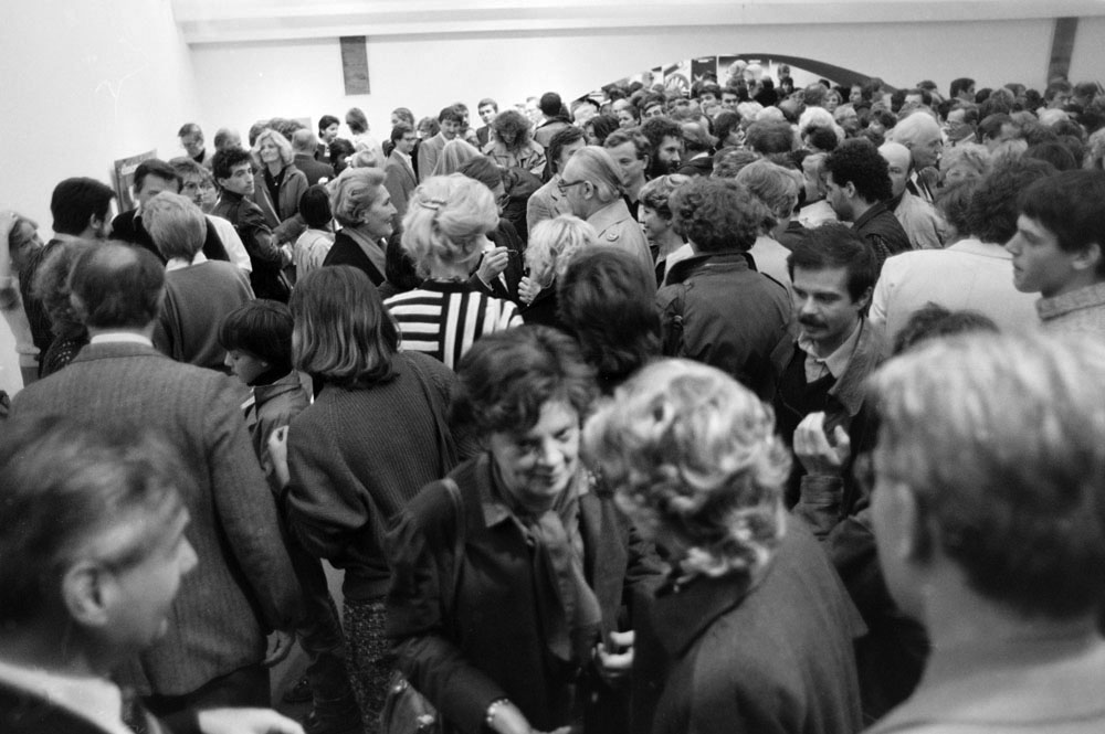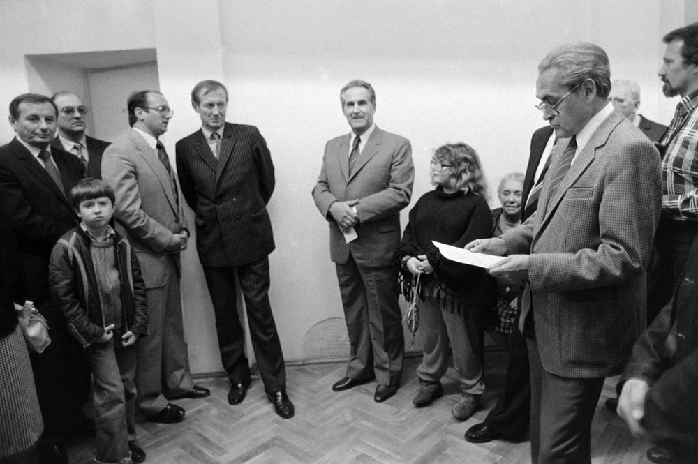 (5) A születésnapi Kertész-kiállítást Féner Tamás nyitotta meg a Vigadó Galériában. Középen Baricz Katalin (térdel), André Kertész, mögötte Borbély Károly, a Művészeti Alap igazgatója