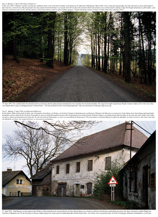 A fotók párokban jelennek meg ebben a művében is: az útra vetett pillantás s a táj egy-egy felvétele kerül egymás mellé. A közeg és ami oda, majd onnan elvitt. A lefelé vetett és a felnézésben megvalósuló pillantás. Van, ahol üres bunker, vasúti vagonok hozzák be az ember jelenlétének képzetét – mi több, éppen azokét, akik tevőlegesen vettek részt a tragédiában. A jelenkor emberének jelei: a szemét, a házak, az útjelző táblák végigkísérik a múlt felidézését. És nem csak általuk válik kikerülhetetlenné a kortárs kontextus. A fotópárok ugyanis szövegekkel társulnak: minden naphoz két szöveg is tartozik, írja felül a látványt. (A weboldalon szó szerint „felülírja”, mert csak akkor válik láthatóvá a szöveg-réteg, ha a kurzort a képek fölé visszük.) A felső szöveg a művész naplóbejegyzése arról, hogy mi történt vele aznap, kikkel találkozott, milyen utat tett meg, milyen gondolatai voltak. Személyes, őszinte, keresetlen, semmilyen drámát nem konstruáló szövegek ezek. Alattuk pedig egy hír olvasható az aznapi világ-történésekből. Pol-Pot elfogásának, majd halálának a híre, családon belüli erőszak, értelmetlen gyilkosságok hírei csatolódnak a múltat megidéző képekhez és a személyes jelenhez, amelyben az emlékezet jelenvalóvá és nem felejthetővé teszi azt, ami elmúlt, hiszen pillantásával beleégeti a tájba azt, ami már nincs ott.