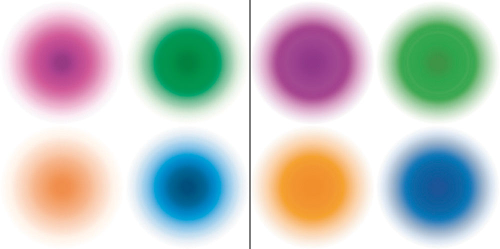 Az illusztráció magáért beszél. A jobb oldalon (aránytartó) jobban megmaradtak a fokozatos átmenetek, míg a relatív kolorimetrikus konverzió esetén még inverziós hibák is felfedezhetők (a lila és a zöld gradiens nem fokozatosan sötétedik, hanem van benne egy újra kivilágosodó rész – azok a színek, amik kívül estek a cél színtéren).