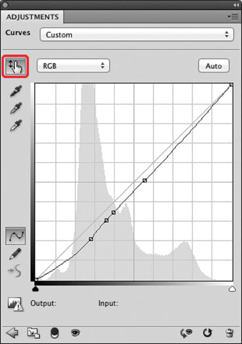 A legegyszerűbb módszer az, ha csinálunk egy görbét egy új rétegben (aminek a cél színtér nevét adjuk), és ezzel kezdjük el az egyes területeket sötétíteni vagy világosítani. Ebben nagy segítségünkre lesz a Targeted Adjustment Tool (az alábbi ábrán pirossal bekeretezett ikonra kattintva kapcsolható be).