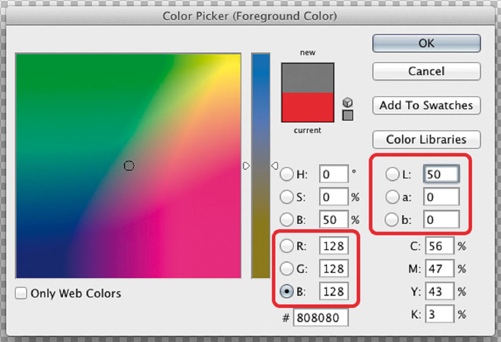 Ezután a Color Pickerben 50%-os L értéket kell beállítani, (a és b nulla kell legyen). Az ennek megfelelő elvárt R, G, B érték 128 lenne.