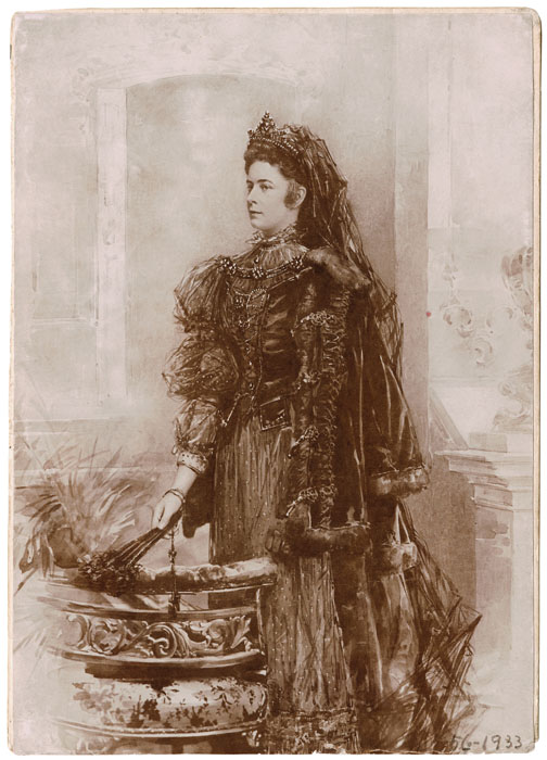 Pietzner fotó (2. kép) nyomán készült Koppaynak egy, csak régebbi publikációból ismert akvarellvázlata, mely az Erzsébet-fejet az 1890-es évekre jellemző hajviselettel és nappali öltözékkel egészítette ki, majd a félalakot ovális keretbe foglalta.40 A fej pozícióját megőrző egész alakos, reprezentatív portré a bécsi Jockey Club számára készült (11. kép).41 A festmény ikonográfiája azonban meglehetősen szokatlan volt, akkor is, ha figyelembe vesszük, hogy a kép nem Magyarországra készült. A trónörökös halála után a nyilvános szerepléstől még inkább tartózkodó idős császárné ugyanis a festményen a 90-es évek divatját követő, mélyen dekoltált, strucctollszegélyes, uszályos báli ruhában jelent meg, kezében strucctollas legyezővel, hajában az 1879-es Georg Raab-portrén ábrázolthoz hasonló diadémmal, mellén rendjellel.42 A festmény másik fotóelőzménye egészen meglepő: az alak beállítását és a ruha sziluettjét Koppay egy, a baden-badeni Jungmann & Schorn műterem által készített fotóról kölcsönözte, amely Erzsébet húgát, Zsófia alençoni hercegnét báli ruhában, tollas legyezővel ábrázolja.43