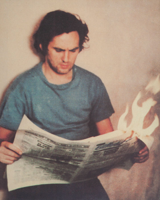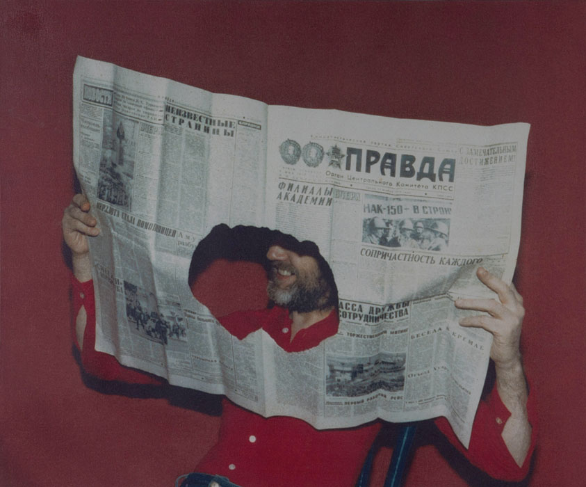 Egy fotón Tót a Pravdát olvassa. Az újságból kitépett „0”-forma, köralakú lyukon át látjuk, amint Tót „örül”. De testnyelve vicsorgó gesztusként is olvasható. Mert a lyuk egyik olvasata: az 56-os magyar zászlóból kivágott szovjet mintájú címer, a katonai megszállás tagadása. Az újság az információáramlás jelképe. Egy másik fotón Esti Hírlapot olvas. A Kádár-kor bulvárlapjaként működött orgánum kimondatlanul is a politika és a nép közötti béke szimbóluma volt. Tót nyugodtan tartja a kezében, pedig a lap már ég. Dali égő zsiráfjával szemben ez nem szürrealista automatizmus, hanem nagyon is kiszámított, kegyetlen „test-mondat”. Dali is tett efféle gesztust, páldául amikor emlékezetes bajuszát ráfestette a Mona Lisa mosolyára/örömére. (Tót ezt az ikont is a végletekig lebontotta: rajzolt egy keretet, és írógéppel középtájt belefestette: „valahol itt a mosoly”). „Adj egy sanszot a testnek, adsz egy sanszot az életnek” – mondta akkoriban a kegyetlen színház guruja, Grotowski. Jan Palach pedig nem sokkal korábban felgyújtotta magát a szovjetek megszállta Prágában.