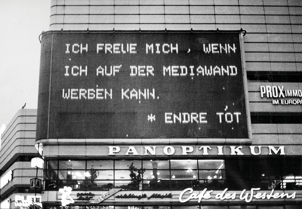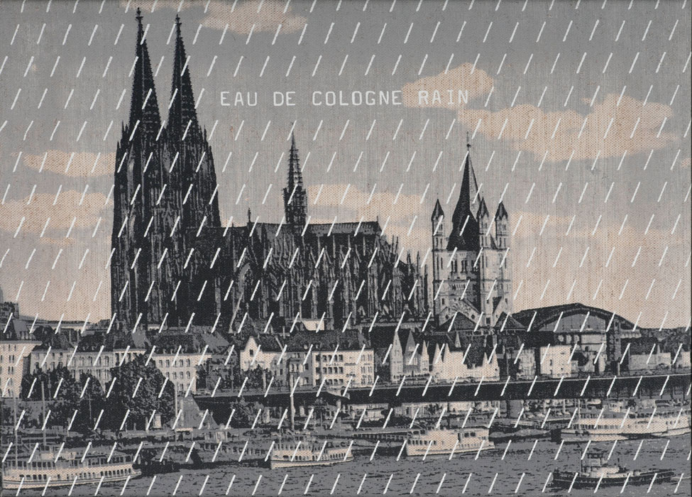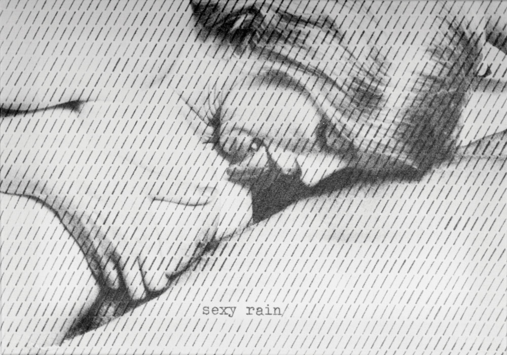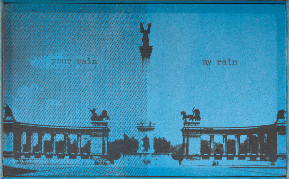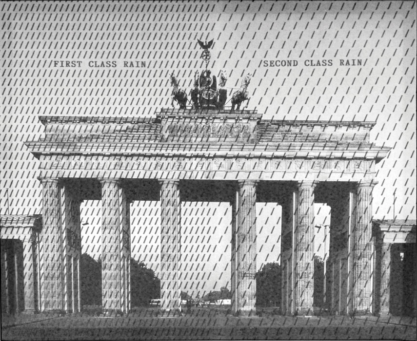Berlini fotó: Brandenburgi kapu, szimmetrikus ortogonális beállításban. A középtengely két oldalán „/”-jelek. Balra sűrűbben: „I. osztályú eső”, jobbra (keletre), egy-egy szóközzel ritkított sűrűségben: „II. osztályú eső”. A megosztott város számtalan metaforája benne van ebben a szűkszavú poénban. Ugyanez a Hősök tere fotójával: balra „a Te esőd”, jobbra „az élet napos oldala”. Az, hogy itt húsz éven belül újratemetik majd Nagy Imrét, ugyanolyan abszurditás volt akkor, mint hogy itt lenne a szocializmust építő Kelet-Budapest és a kapitalista Nyugat-Budapest Népköztársaság útján húzódó politikai határa, mint amilyen abszurd ötven év futott le csendben a jaltai egyezmény szellemében. A kölni dóm sötétebb tónusú fotó, így fehérek a „/”-jelek (címe: Eau de Cologne). Azután négy topless girl – valószínűen sajtófotó-nyomat használatával – öröme/mosolya: „left rain”, right rain” (Sexy rain). Ha filozófiai példázatként olvasom: a nyelv nem képes kifejezni a gondolatot.