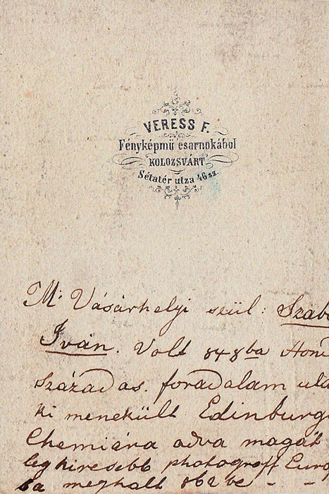 A kép verzóján levő felirat szerint a kép Szabó Ivánt ábrázolja. Mivel más, hiteles ábrázolást nem ismerünk róla, a Veress Ferenc jelzetű vizitkártya felirata alapján fogadjuk el, hogy ő van a képen. Áttételesen megerősíti ezt, hogy a műterem berendezése alapján Szabó műtermében készültnek kell tulajdonítanunk a felvételt, s feltesszük, hogy nem Veress Ferenc a kép készítője. Annyi bizonyosnak látszik, hogy Szabó nem merészkedett haza az 1849-es emigrálását követően, a menlevél nem volt biztosíték a bántatlanságra. Talán feltételezhetjük, hogy a Glasgow Photographic Society 1859. áprilisi–májusi kiállításán szerepelt, Szabó egykori segédje, James Farmer által készített egész alakos portrét látjuk Veress Ferenc vizitkártya reprodukciójában.