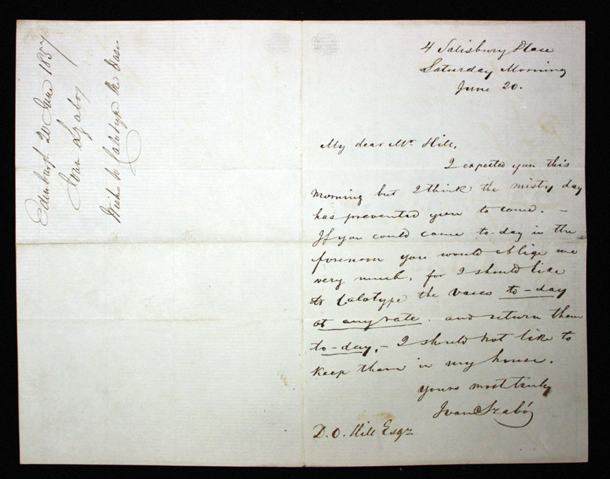 A tévedést, ahogyan azt James Downs a Szabó életútját ismertető cikkében feltárta, valószínűleg egy 1858 júniusában Constance Talbot nevére kiállított számlán szereplő, „Mr. Talbot”-ra való utalás miatti félreértés okozza.53 Az itt megjelenő „Mr. Talbot”-ot többen W.H.F. Talbotnak gondolták-gondolják, nem pedig a fiának, Charlesnak, akit Ela nővérével együtt Szabó 1858. április 20-án valójában (forrásokkal igazolhatón) lefotózott. A másik két Talbot leányt, Matildát és Rosamondot, 1858. április 27-én fényképezte le.54 Az egészen bizonyosnak látszik, hogy személyesen ismerték egymást Brewster professzoron keresztül, s a fényképezés lehetősége nem zárható ki. Szabó számláján Talbot mindhárom lányáról szó van, „Mr. Talbot”-tal együtt, akiről viszont James Downs-szal közösen azt gondoljuk, hogy Talbot fia, Charles, aki 1858. február 2-án 16 éves volt.