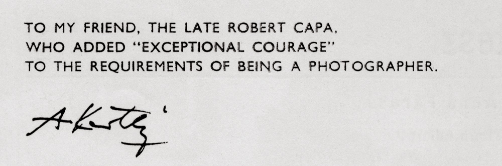 1966-ban, tizenkét évvel a fiatalabb pályatárs halála után, André Kertész az alábbi szavakkal ajánlotta Robert Capa emlékének a Paragraphic Books sorozat róla szóló kötetét: Barátomnak, a néhai Robert Capának, aki a kivételes bátorságot a fotográfus-lét alapkövetelményévé tette.