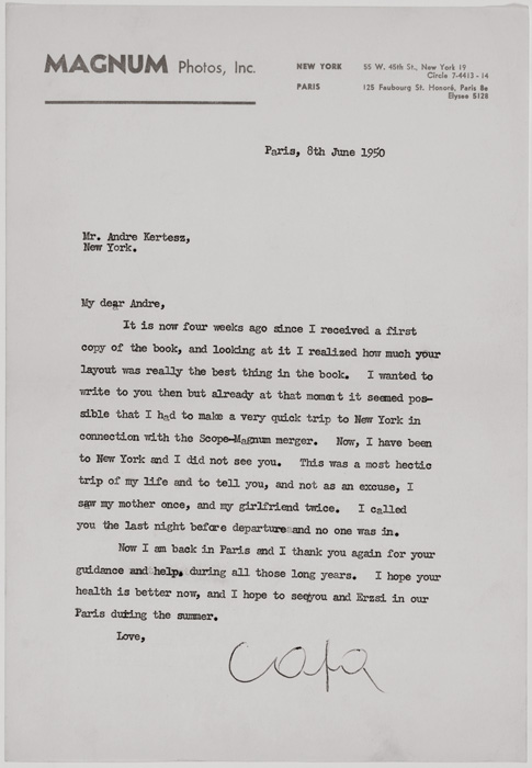 1938-ban Capa már Kínából írt Kertészéknek. A New School for Social Research-ben bemutatott Death in the Making című fényképkiállítás megnyitóján nem volt jelen, mert Joris Ivens stábjával Keletre utazott.12 Aztán egy időre közbeszóltak az események, kitört a világháború, és látszólag eltűntek a nyomok. A Kertész-archívumban az 1938-ason kívül csupán egy másik Capa-levelet őriznek, 1950-ből. A június 8-án, Magnum-fejléces papíron, laza angolsággal gépelt – vagy diktált – üzenet magyarul így szól: „Drága Andrém, már négy hete, hogy megkaptam a könyv egyik első példányát, és ahogy megnéztem, rájöttem, hogy mennyire a te layout-od volt a legjobb dolog a könyvben. Akkor írni akartam neked, de már akkor úgy volt, hogy gyorsan New Yorkba kellene utaznom a Scope-Magnum egyesülés miatt. Most New Yorkban voltam és nem láttalak. Ez volt életem legmozgalmasabb útja és őszintén mondom, és nem kifogásként, hogy anyámat egyszer láttam, s a barátnőmet kétszer. Hívtalak az utolsó este, de senki nem volt ott. Most megint Párizsban vagyok, és megint köszönöm a tanácsaidat és a sok évi segítségedet. Remélem, már jobban vagy, és remélem, látlak téged és Erzsit a mi Párizsunkban a nyáron. Szeretettel, Capa”13