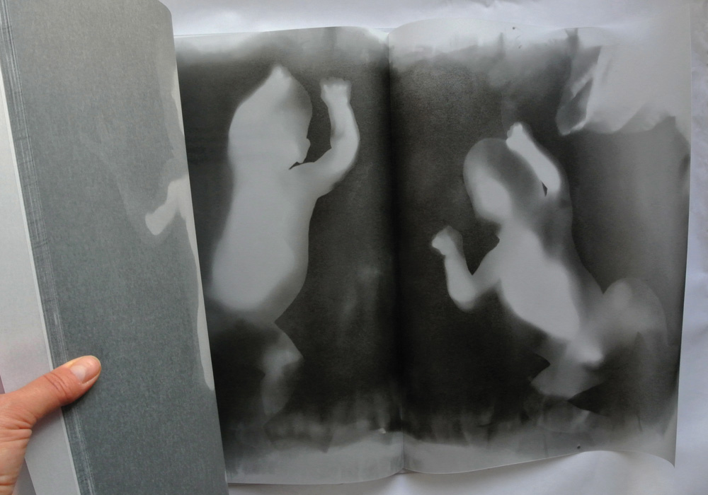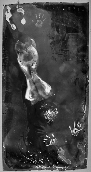 – Annak Inverzió (átfordulás) a címe. Bekentem magam tetőtől talpig fixírrel, ráálltam a körülbelül kétméteres fotópapírra, bukfenceztem egyet, és a végén fölálltam. Az elején is van talpnyom és a végén is. Van egy másik nagyméretű fotogramom, a Kúszás, ott megkértem valakit, hogy feküdjön rá a papírra, és jusson el a papír egyik végétől másik végéig, közben fényceruzával állandóan követtem, körberajzoltam a testét.