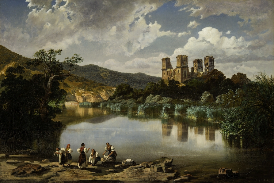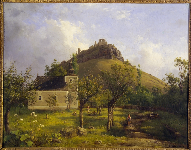 Az akadémiai stílus magabiztos mestere Ligeti Antal (1823‒1890) volt, a magyar várakat megörökítő sorozata a Magyar Tudományos Akadémián mintaként szolgált a kulturális épületekben díszként funkcionáló művekhez. Képeinek igen szabályozott a felépítése, hiszen a középtérben helyezkedik el a vár vagy a hegyvonulat súlyos tömege. Az előtérben általában út kanyarog, szekér porzik vagy víztükör csillog. A háttér kitágul a végtelenig és az ún. „légtárlat” rétegeit színekkel, a fény vibrálásával igyekezett visszaadni. Ligeti nem vált történeti festővé, bár próbálkozott, festőtársaival közös művekben (Weber, Munkácsy) ő a tájat festette meg (le), míg mások a történeti jelenetet. „Ligeti tájainak történelme a jelen látványának pontosan megragadott részleteiben és történelmi fragmentumainak múltat idéző méltóságában jelenik meg.” – írja Szabó Júlia.12 Veress felvételeinek egy része Ligeti munkásságával szoros kapcsolatba hozható, függetlenül attól, hogy a fényképész látott-e ilyeneket.