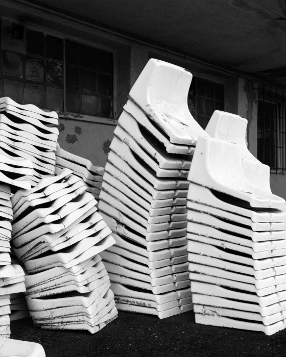 Éppen ellenkezőleg, a Cinema Cities a gépiességre, a fogyasztásközpontú szemlélet tompaságára irányítja a figyelmet: szereplői (a popcornos boy, a takarító lány vagy a plakátcserélő férfi) kétdimenziósak, érzelmek nélküli „alkatrészek”, akik csupán működtetik a szisztémát, de nem lakják be azt (ellentétben Lakos bíróságaival). Ezért lehetséges, hogy sokuk arca nem látszik: nem fontos. Mégis, héroszok ők, a spektákulum társadalmi mítoszának hétköznapi hősei, ellenpontozza Kovács a mozivászon tekercset leszerelő emberek fotójával Ivo Dzsimán 1945-ös ikonikus képét, ahol egy katonacsoport zászlót állít.xii Ezen túlra azonban nem lép, nem ábrázolja, hogyan nyomja össze az embereket ez a mesterséges környezet; nem él azzal a lehetőséggel, hogy valódi kritikát fecskendezzen a glamour világába, jóllehet a takarítóeszközök versus a „Tükröm, tükröm…” plakát csendélete utal ennek lehetőségére. Képei egyesével ugyan tökéletes, szigorú kompozíciókat követnek, de nem tömöríthetők egy határozott koncepcióba, egy-egy fotó valahogy mindig kibújik a „felelősség” alól.