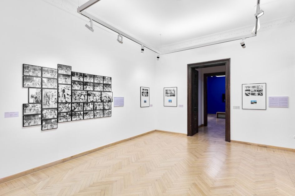Az emeleti kiállítótérben nagyobb hangsúly kerül Hámos Pratschkéval közös alkotói tevékenységére: a 2024-es Építkezés a föld alatti parkoló bejárata előtt, illetve Gyepsarok a föld alatti parkoló bejárata előttcímű munkák a - Hámos korai művei esetén is hangsúlyossá váló - tér-idő problematikát helyezik fókuszba. A fotók az egyéni és kollektív emlékezet kérdéseit urbánus és publikus terek történetein keresztül járják körül. A látás multiperspektivikus rekonstrukcióján alapuló képegyüttesek - Hámos 1970-es évekbeli analitikus attitűdjét folytatva - kiterített gömbszerkezetként vagy térben megvalósított fotóobjektként jelennek meg. A fotóobjekt nem csupán egy gömbperspektivikus térkonstrukció kicsinyített mását, de tér és idő egy pontba sűrítésének tárgyi megvalósulását is jelenti.