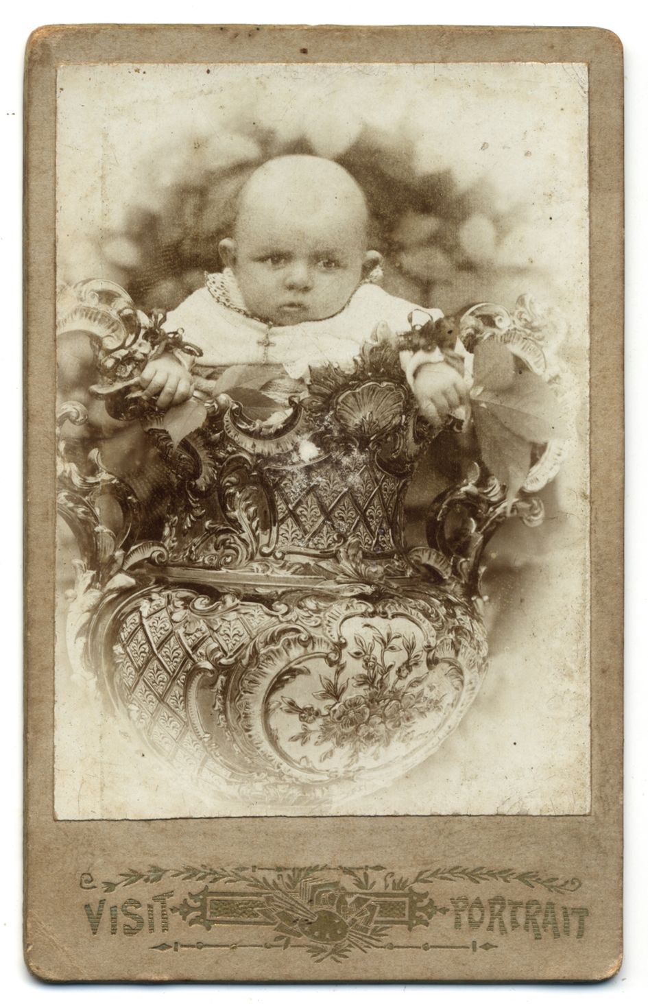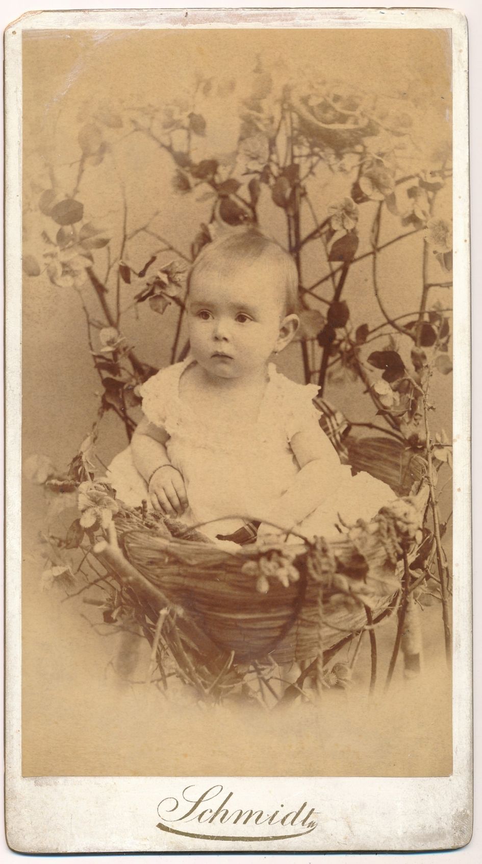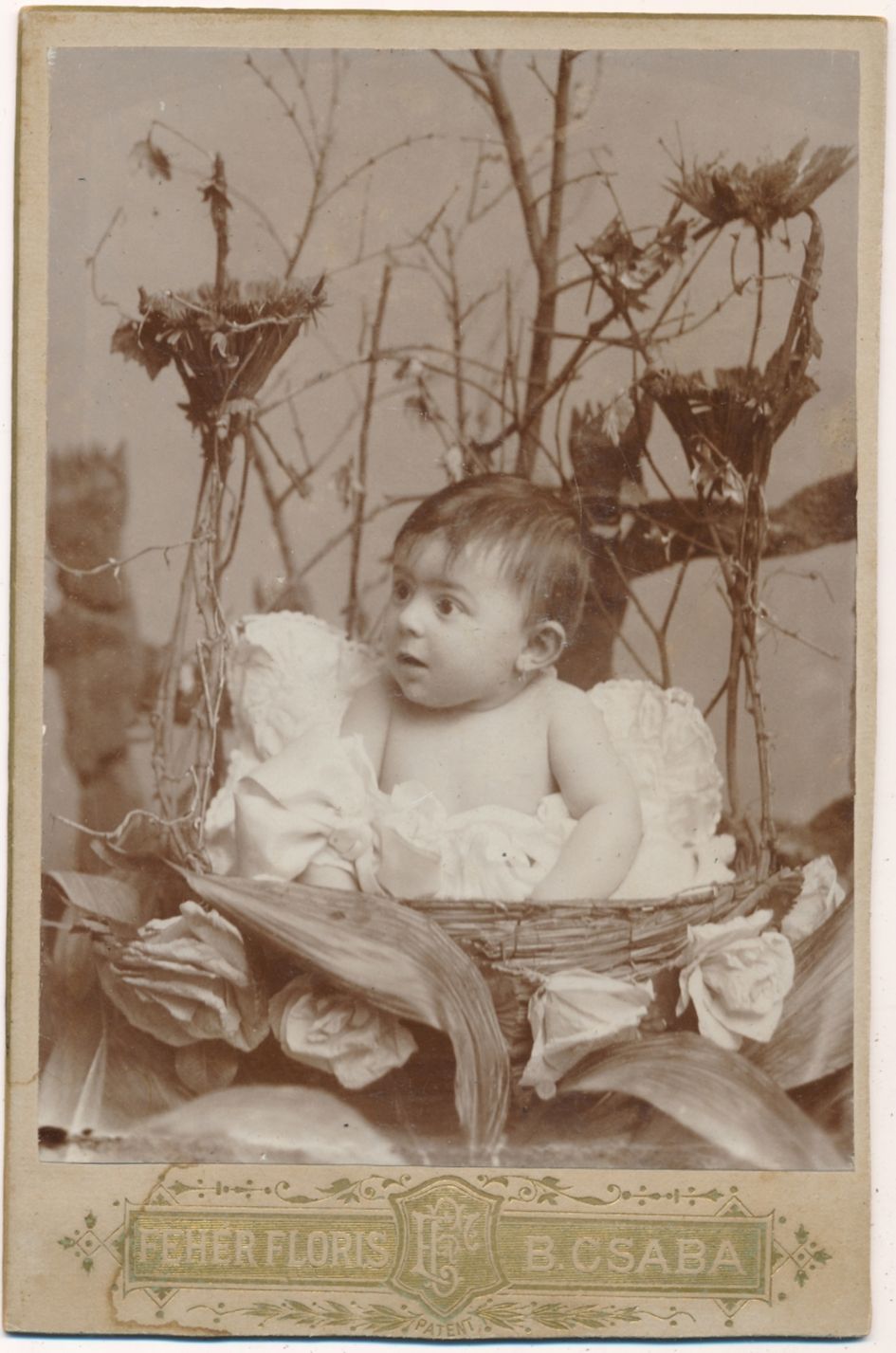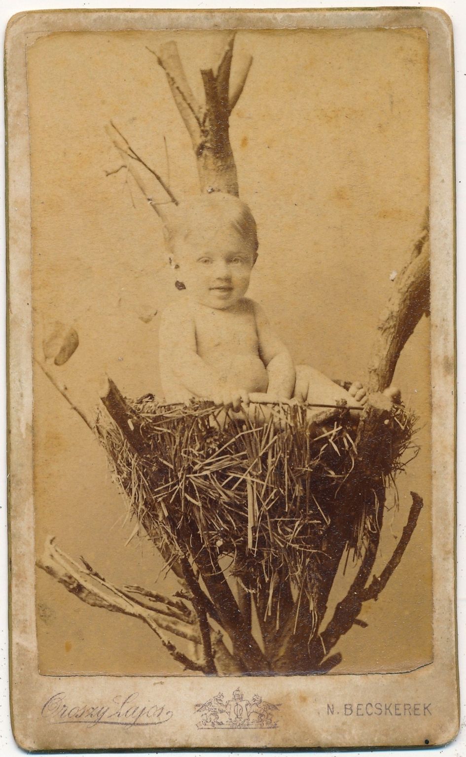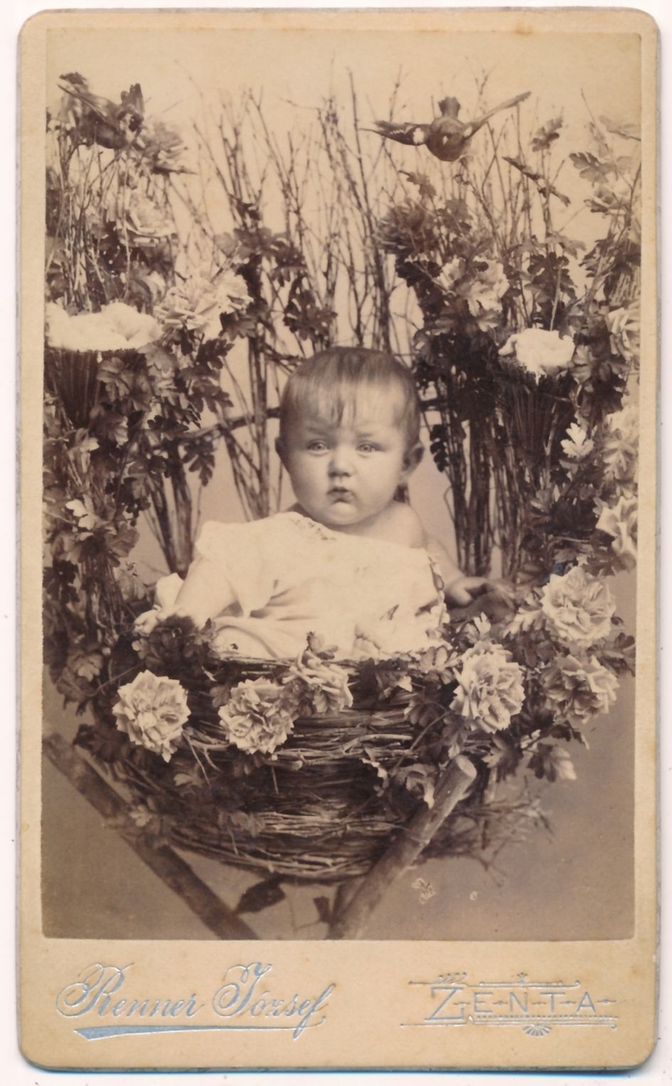Néhány fészekben ábrázolt gyerekkép a fényképészek különös fantáziájára utal vissza, erősítve azt a feltevést, hogy bizonyára mindegyiknek megvolt a maga képzőművészeti, esetleg külföldi fényképészeti, később levelezőlapon is terjedő mintája. A magyar anyagban ilyen típusú ábrázolással eddig nem nagyon találkoztunk, és az ismert fényképeket kedvesen viccelődő attitűdként kezeltük. Most bemutatásra kerül a 19. század végéről Oroszy Lajos (Nagybecskerek), Schmidt Ede (Budapest), Renner József (Zenta), Fehér Flóris (Békéscsaba) munkája. (2‒5. sz. kép) Mai (Manó) és Társa nem mindennapi fonott kosárba ültette modelljét, hasonlóképpen egy különös váza szolgál fészekként egy másik képen.6 Ez utóbbi kép készítőjét nem ismerjük, már nem jelezte nevét a kép hátlapján. (6‒7. sz. kép)