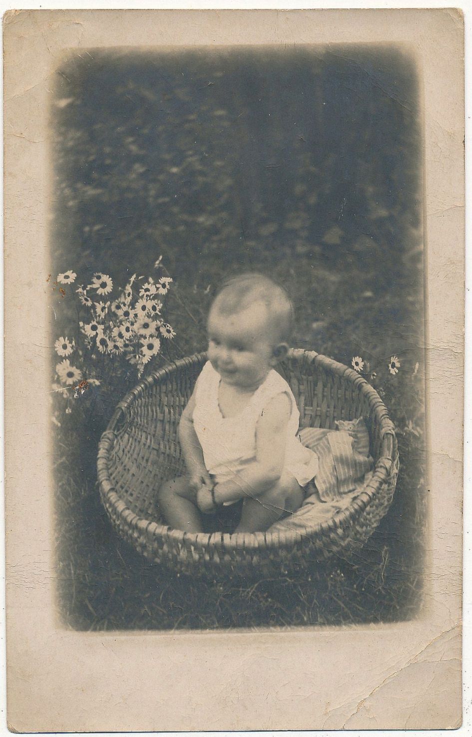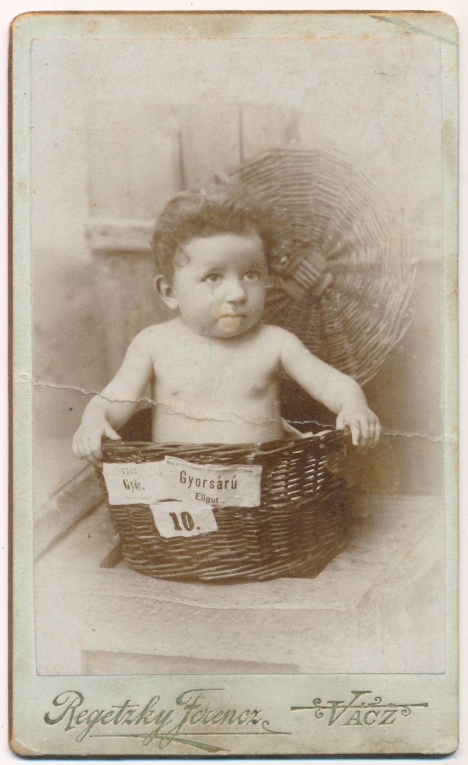 Langsfeld Mór (Kaposvár) papírtojásban ülő, Regetzky Ferenc „gyorsáru” feliratú képe viccelődésként ritkaságnak tekinthető. (8‒9. sz. kép) Ez utóbbi Borsos Eszti kislányt ábrázolja 10 hónapos korában 1898. augusztus 8-án. A levelezőlapok korában az említett minták alapján postán küldhető variációk sorozata alakult ki, melyek tobzódtak a szimbólumok felidézésében. Az egyik képen a fészket helyettesítő kosár fölött eszményítő keretezést is alkalmaztak. (10. sz. kép) Ebben az esetben egy fényképet emeltek piedesztálra, melynek virágokkal való keretezése utalhat a gyermek elvesztésére is. A kép helyettesítette a gyermeket, mely ilyen formán örökké megmaradt. A rekvizitumok így egyesítik a születést és a halált, segítik az emlékállítást, a trauma feldolgozását. Ellenkező előjelű a másik kép, mely amatőr szinten fogalmazta meg a születés toposzát. A kosárban ülő gyerek beállított, de szabadban készült amatőr felvétel, mely azt az utat mutatja, ahogyan az egykori szimbólumok eltűnnek, átalakulnak a megörökítés rutinjában. (11. sz. kép)